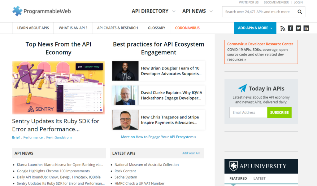 Juhtiv API uudiste ja teabe allikas, mis jälgib selle valdkonna arengut kogu maailmas ja pakub veebi API kataloogi.