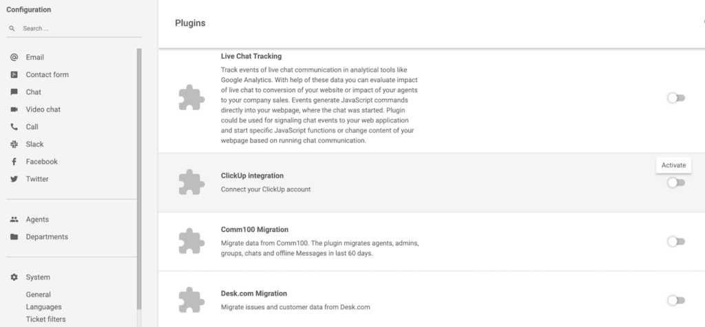 - ClickUpi integreerimiseks avage LiveAgent ning liikuge Seadistamine > Süsteem > Pistikprogrammid. Otsige nimekirjast ClickUpi pistikprogramm, vajutage aktiveerimise lülitile ning LiveAgent taaskäivitub.