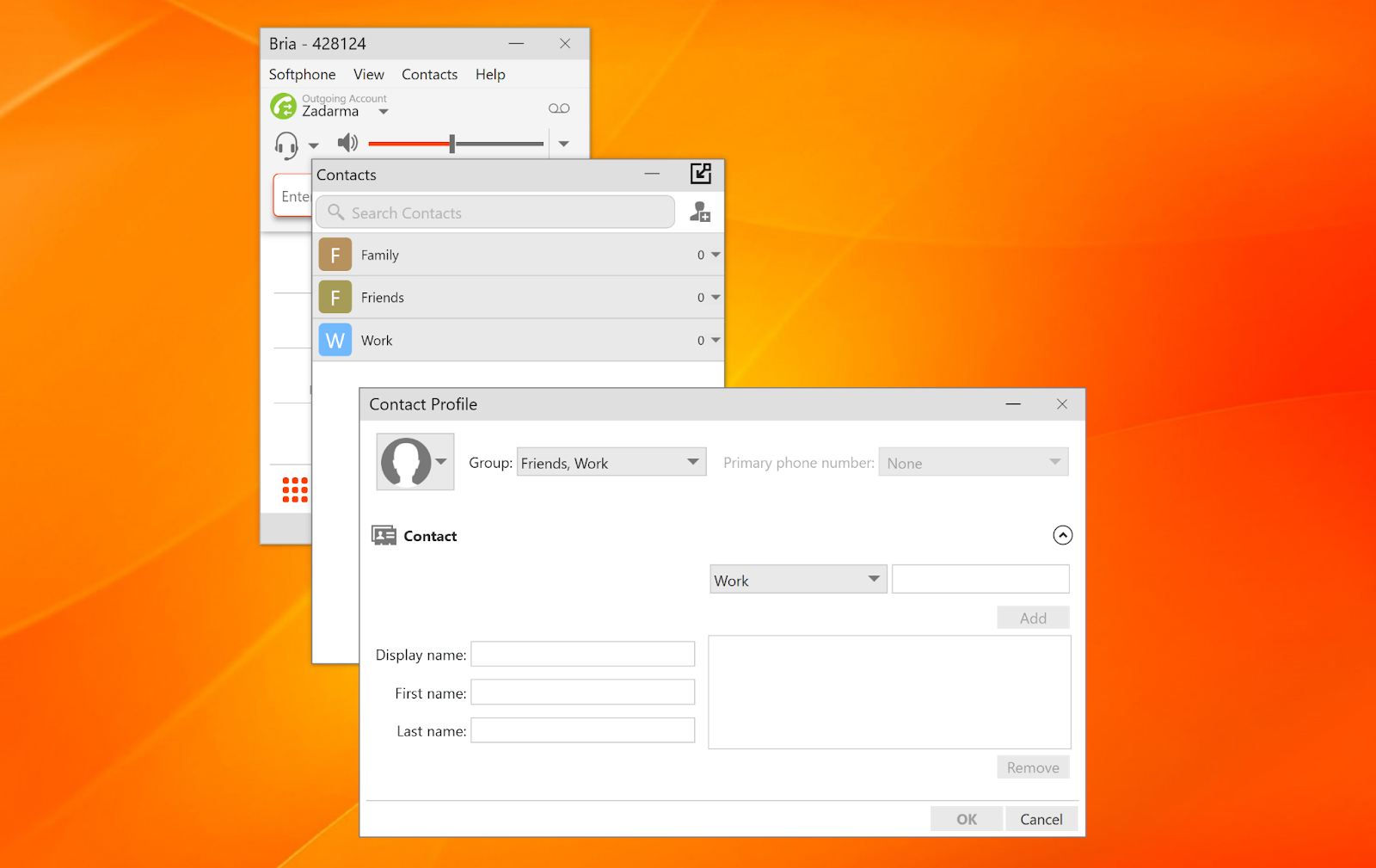 Uue kontakti loomine kaasnevad mõningad valikud: kuvatav nimi, eesnimi, perekonnanimi ning väli numbrite ja aadresside salvestamiseks: tarkvaratelefoni number, töönumber, kodunumber, e-posti aadress, veebisait ja valik „Muu”, kus kasutajad saavad sisestada kohandatud andmed. Puudub võimalus, mis lubaks kasutajatel kontaktandmetesse kommentaare või lihtsaid märkuseid kirjutada, mis on Bria kontaktiloendi veel üks puudus.