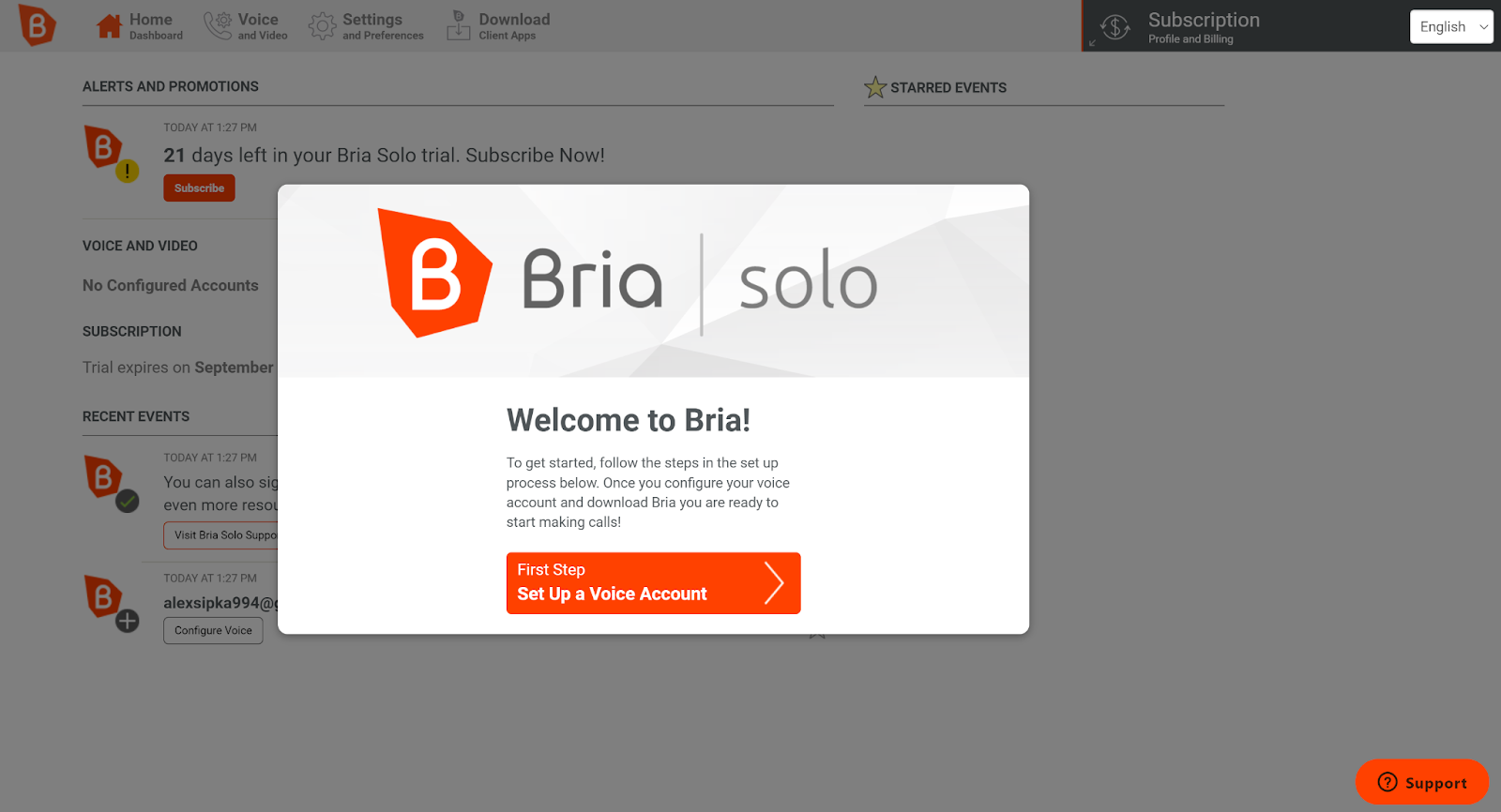 Protsess algab uue konto loomisega Bria veebisaidil. Alustuseks tegin prooviversiooni. Valisin käesoleva ülevaate jaoks Bria Solo prooviversiooni. Selle täitmiseks kulub vaid paar minutit ja veebisait ei sundinud mind valima makseviisi ega lisama krediitkaardiandmeid. Kui olin oma andmed esitanud, tervitati mind oma kontole lihtsa sõnumiga, mis juhendas mind edasisi toiminguid tegema.