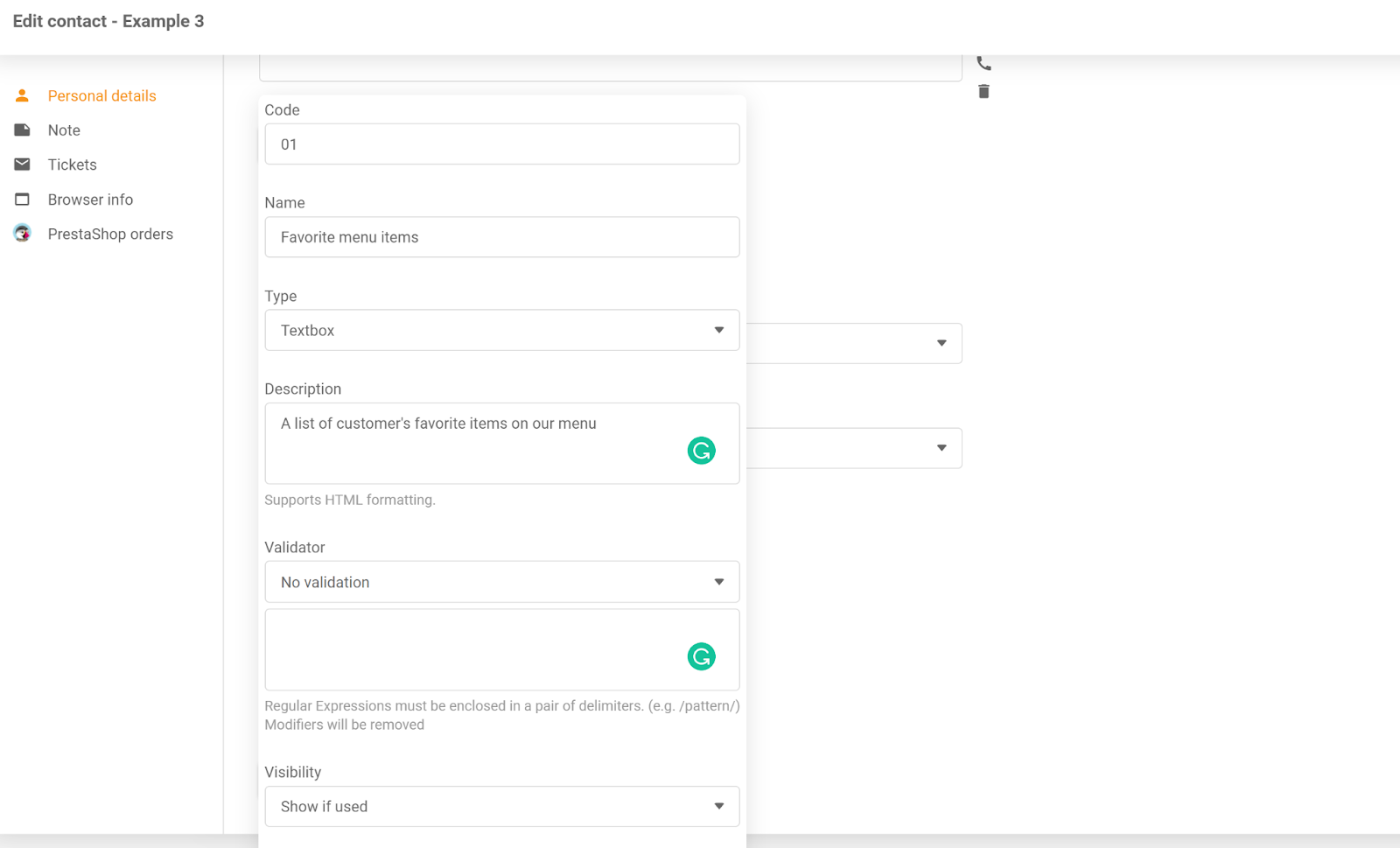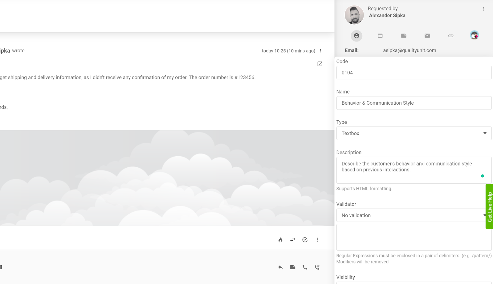 Üks parimaid kohandamisvõimalusi kontaktide ja ettevõtete jaoks on kohandatud väljad. See funktsioon võimaldab igal kasutajal oma kontaktandmete kogemust vastavalt kohandada. Saate lisada mitmeid kohandatud välju, anda neile nimed ja täita vajaliku teabe. See funktsioon on kasulik igat tüüpi ettevõttele, kuna see võimaldab teil segmenteerida kliente vastavalt enda valitud kriteeriumidele. Olenemata sellest, kas tegemist on teatud tüüpi üldise teabega, nagu riigi andmed, või kliendi jalanumber, kõike on võimalik salvestada kontaktandmetesse. Välju on võimalik kohandada toimima märkeruuduna, tekstiväljana, loendina ja muuna. LiveAgent võimaldab teil määrata ka nende andmete nähtavuse.