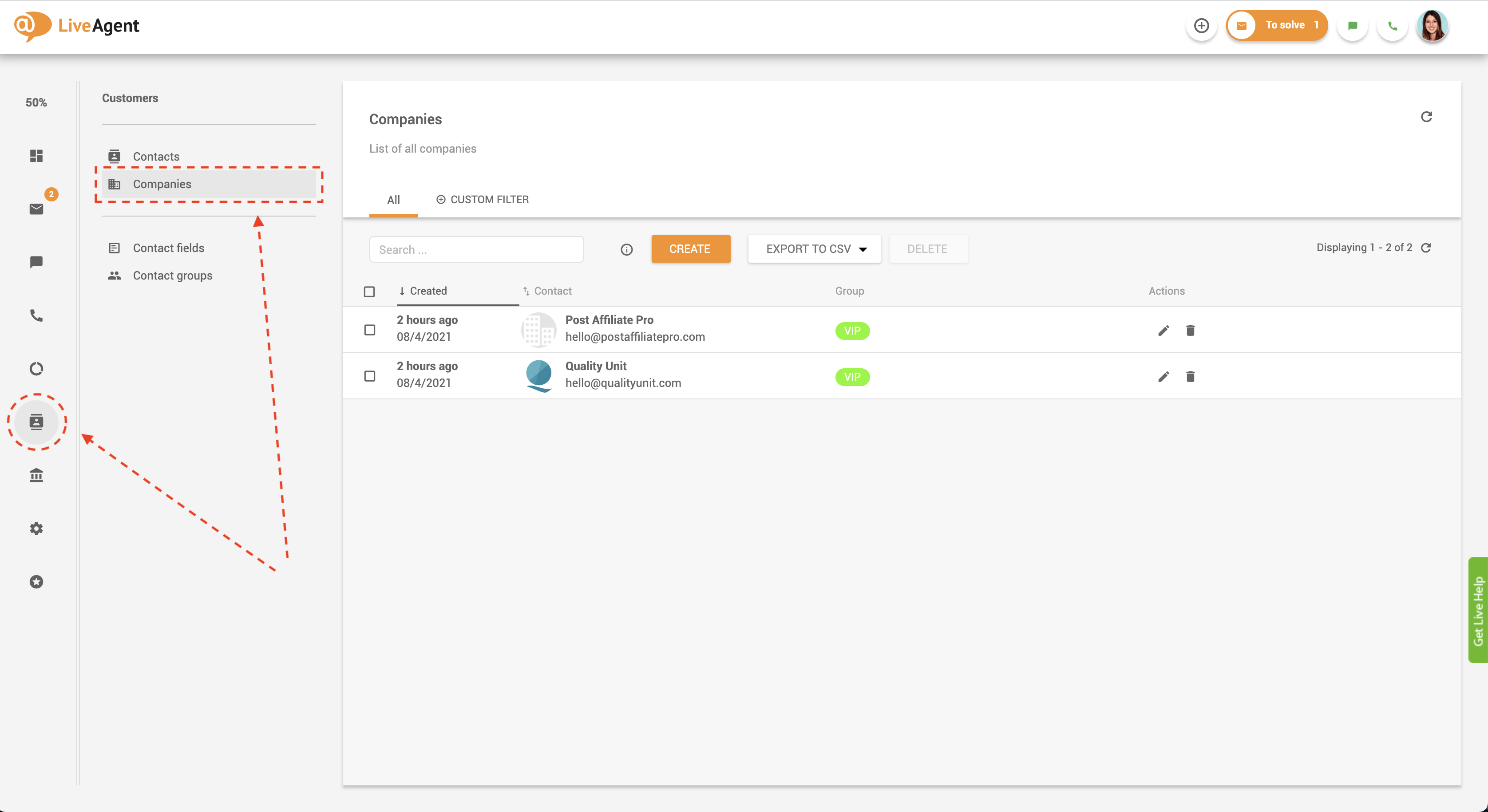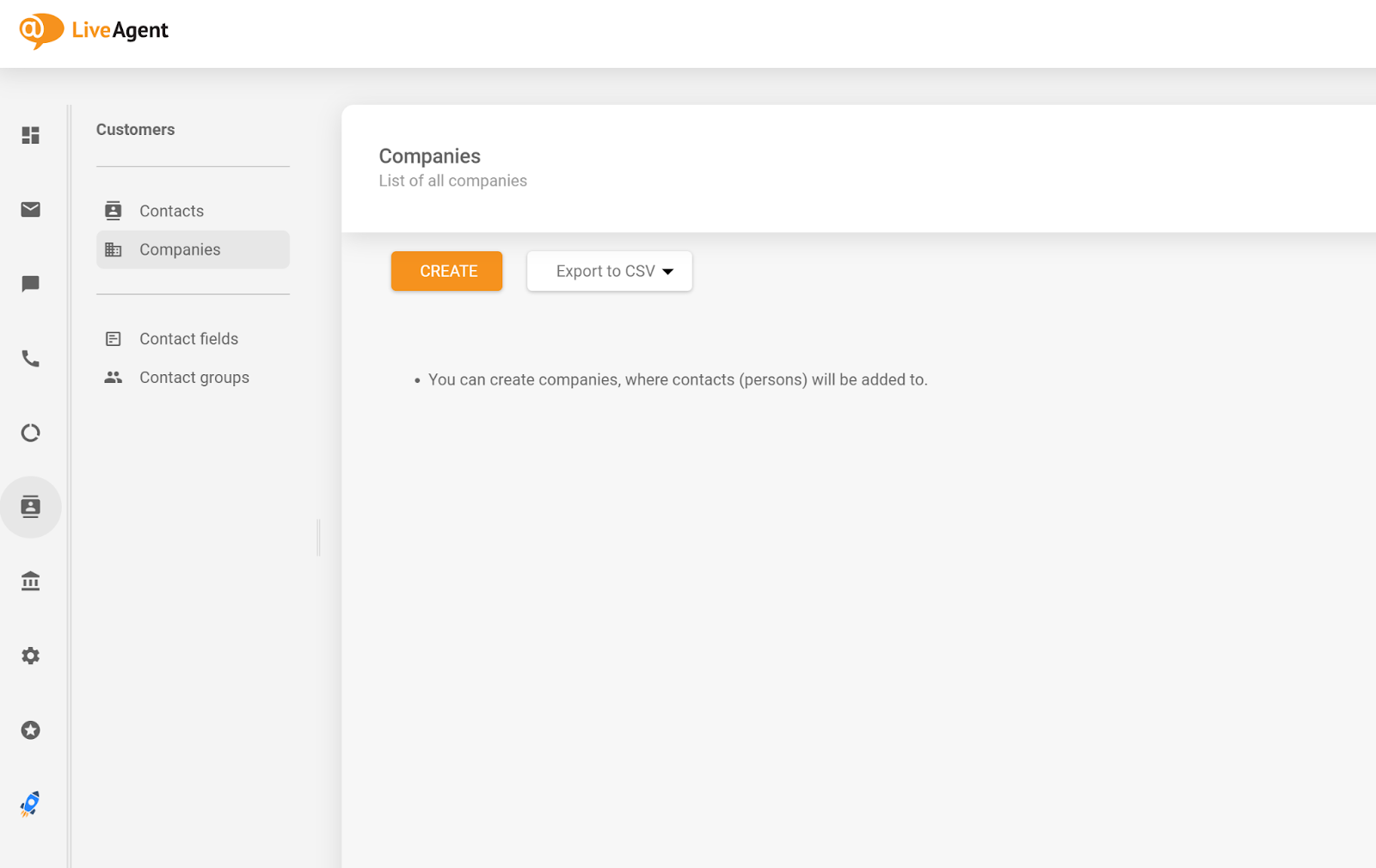 LiveAgent suudab koguda ja salvestada erinevate ettevõtete teavet, kellega kontakti võtate. Kasutajaliides töötab täpselt nagu kontaktide jaotises, saadaval on peaaegu sama tüüpi teave. Saate ettevõtte teabele igal ajal hõlpsasti juurde pääseda ja seda vastavalt oma eelistustele muuta.