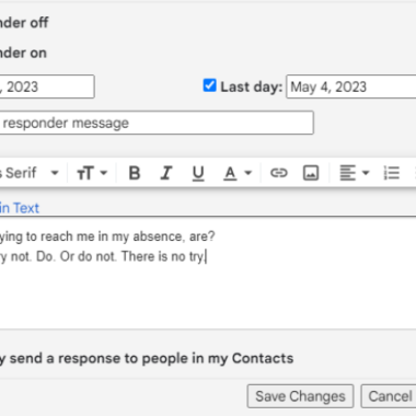 Saate määrata oma äraoleku esimese ja viimase päeva ning kohandada sõnumit oma maitse järgi. Kuigi saate lisada linke sobivatele veebisaitidele või osakondadele või lisada pilte, otsustasin jätta selle lühikeseks ja armsaks.