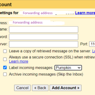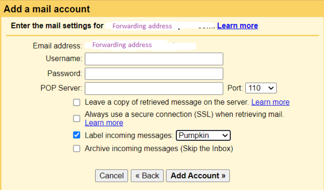 Edastamisaadressi lisamiseks klõpsake nupul Lisa edastamise aadress. See käivitab hüpikakna, kus peate sisestama edastusaadressi, parooli, POP-serveri ja pordi ning soovi korral lisama muud konfiguratsioonid. Kui olete lõpetanud, klõpsake käsul Lisa konto.