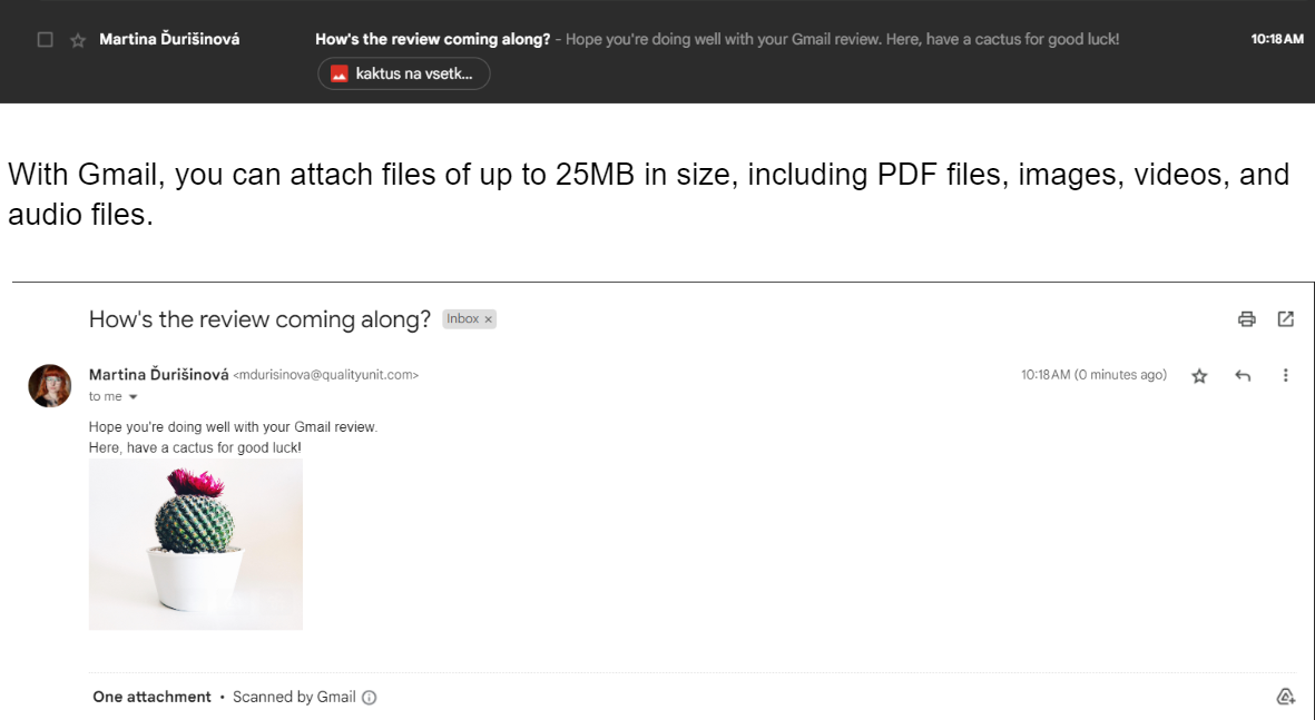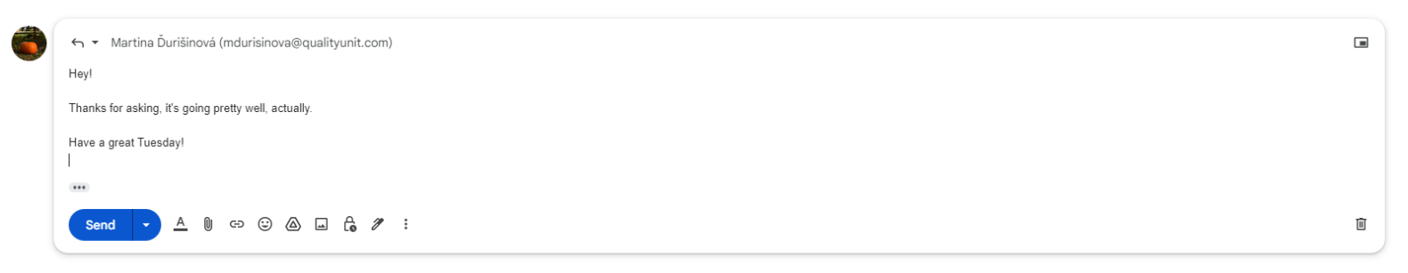 Meilile vastamine on väga lihtne. Peate vaid kirjutama sõnumi ja vajutama nuppu Saada. Kui soovite manustada faile oma arvutist või Google Drive’ist, allkirjastada oma meili või lülitada sisse eelnevalt mainitud konfidentsiaalne režiim, saate seda teha otse sõnumiredaktori kaudu.