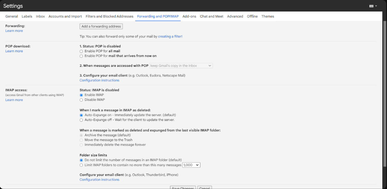 Selle seadistamiseks avage Seaded ja valige vahekaart Edastamine ja POP/IMAP. Seal saate lisada ühe või mitu edasisuunamisaadressi ja anda juurdepääsu oma Gmaili kontole teistelt IMAP-i kasutavatelt klientidelt.