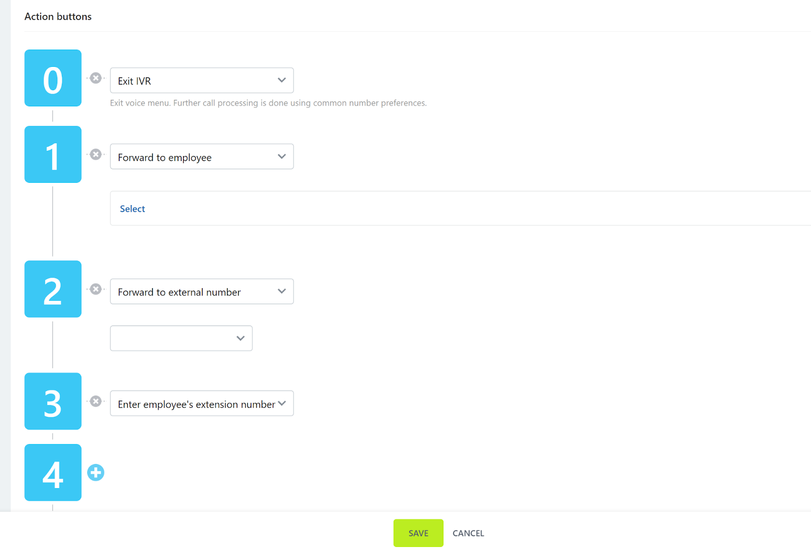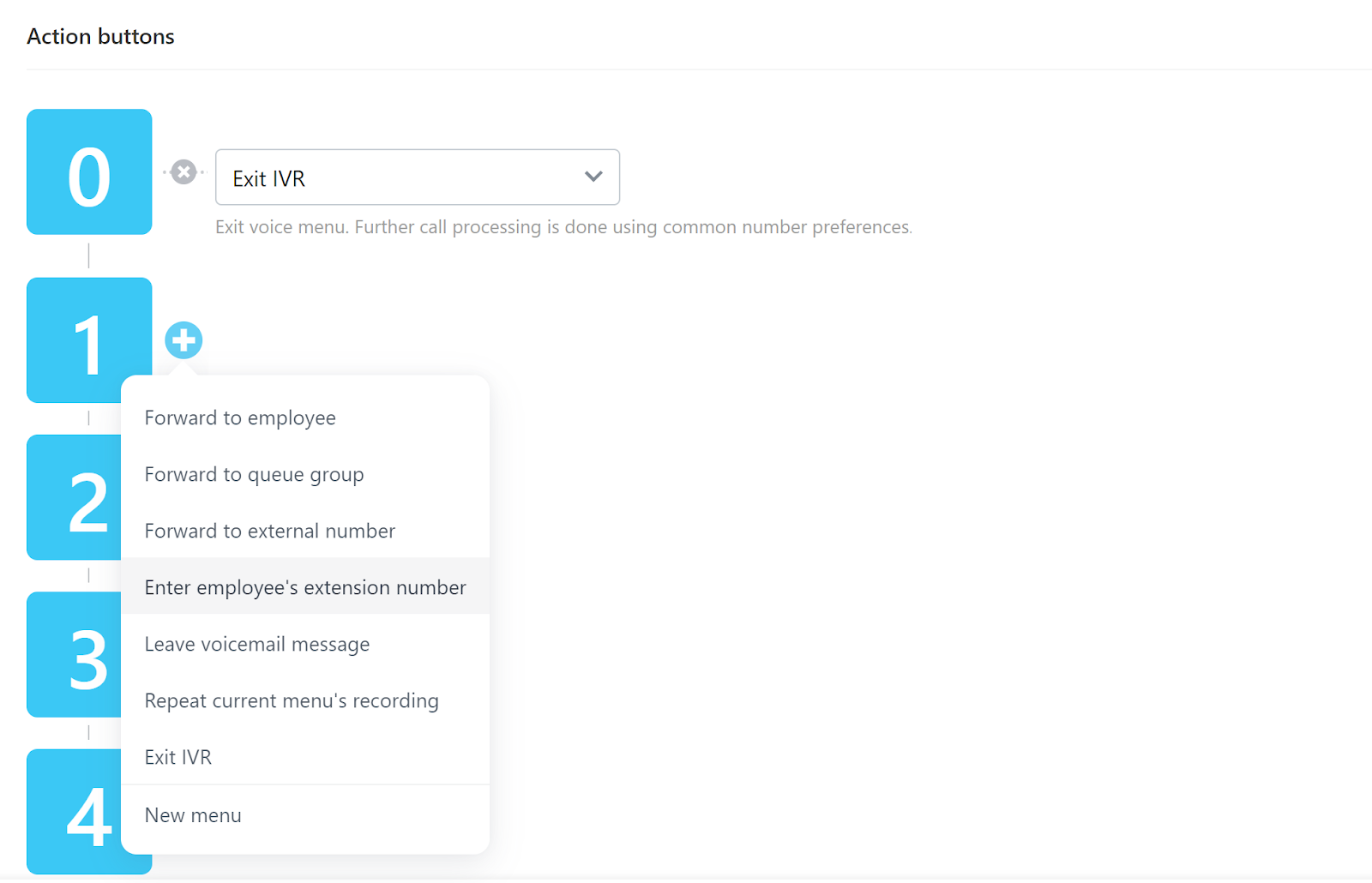 Loomine ei hõlma kasutajaliidese disainimisega sarnast protsessi, vaid pigem võimalust valida milliseid toiminguid helistaja numbrilaual olevad numbrid teevad. Teil on standardne valik edasisuunamise numbreid, nende suunamine teistele kasutajatele ja palju muud. Üldiselt on protsess väga lihtne ja kui olete IVR süsteemidega tuttav, kulub selle läbimiseks vähe aega.