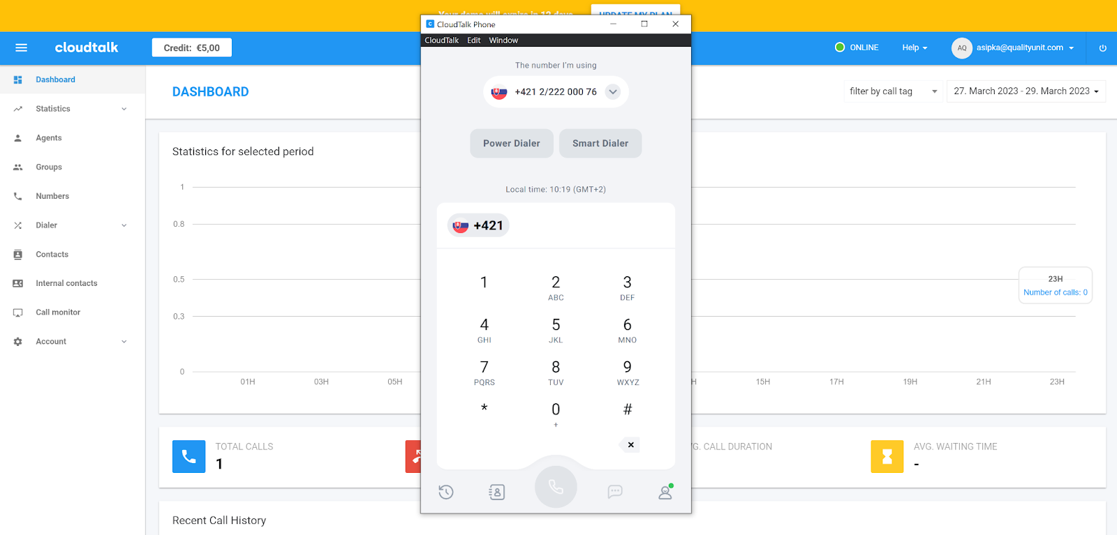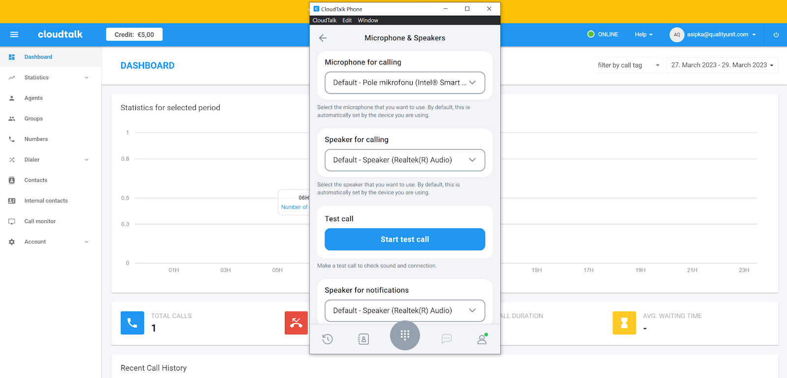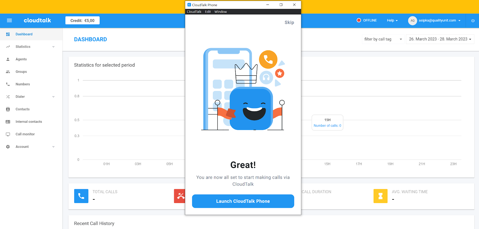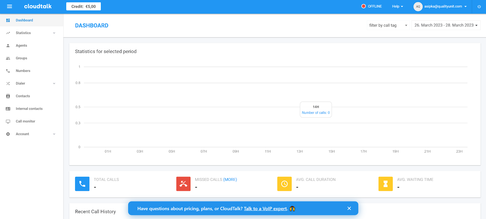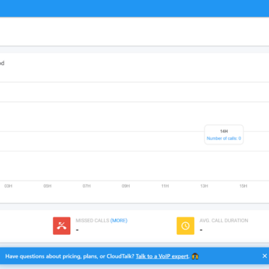 CloudTalkil on väga hea välimusega ja kaasaegse tunnetusega liides. Navigeerimine tundub algusest peale lihtne, nii et teil ei tohiks olla probleeme otsitavate valikute leidmisega. Peamisel juhtpaneelil kuvatakse statistika valitud ajavahemiku kohta, nagu vastamata kõned, keskmine ooteaeg ja keskmine kõne kestus. Kõik navigeerimisvalikud asuvad vasakpoolsel menüüribal. CloudTalk annab kõnedega alustamiseks ka 5 dollarit krediiti. Kasutajakogemus on sama suurepärane ka CloudTalk Phone’i rakenduses.