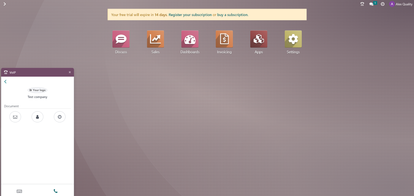 Odoo võimaldab teil alustada tasuta, kui valite registreerimise alguses ainult ühe rakenduste paketi. Kui valite rohkem kui ühe, saate valida tasuta prooviperioodi, kus on võimalik proovida mitmeid Odoo funktsioone. Veebisaidi andmetel on kõnekeskuse funktsioonid Müügi valiku all, kuid olen üsna kindel, et pääsete neile juurde ka mis tahes muu valikuga. Registreerimine on üsna kiire ja lihtne. Teid suunatakse kohe liidesesse, kuid kõigepealt peaksite kinnitama oma e-posti aadressi, kuna Odool on selle toimingu jaoks määratud ajaline piirang.