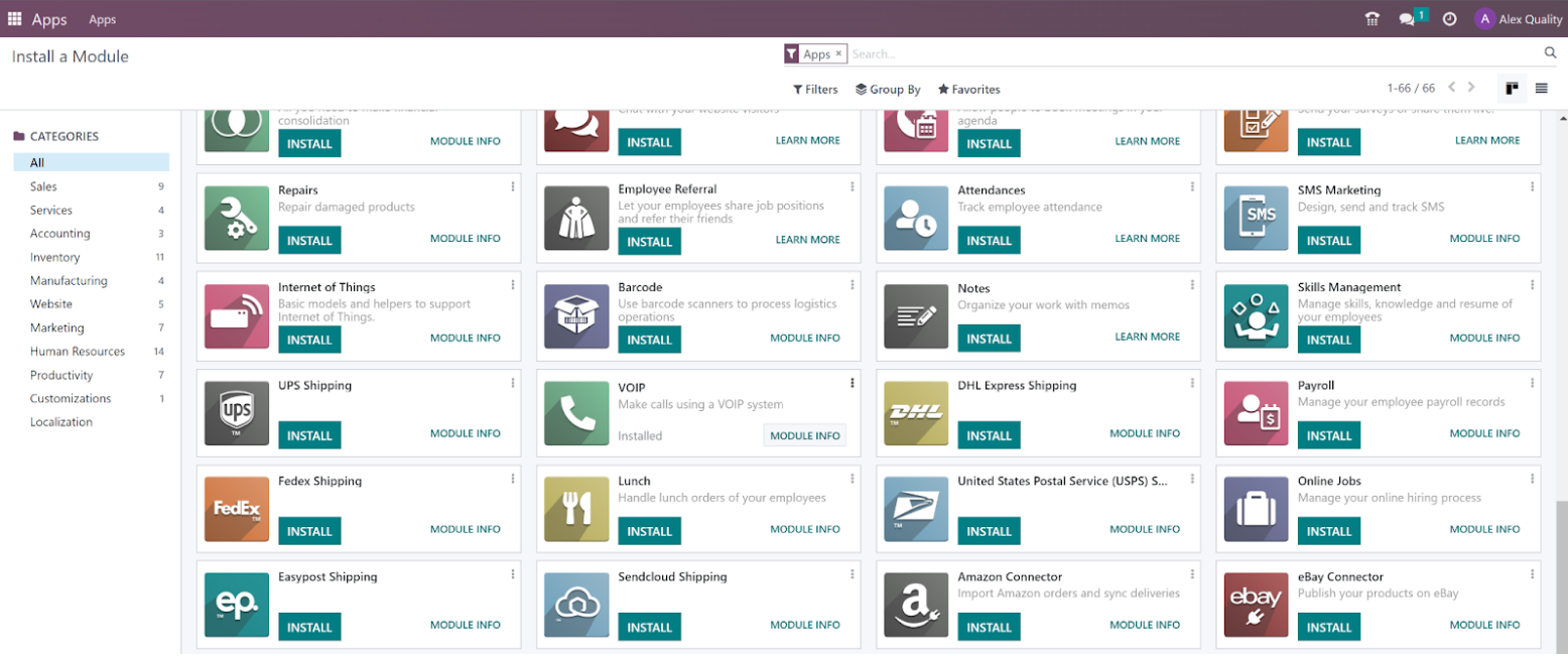 Kui soovite oma Odoo kontol VoIP funktsiooni kasutada, peaksite pärast liidesele juurdepääsu suunduma otse rakenduste jaotisesse. Sain teada, et see rakendus pole Müügi valiku all, vaid pigem Produktiivsuse all, seega soovitan teil seeregistreerimisel valida just selle, et vältida tasuta prooviperioodi. Mooduli installimine on väga lihtne, piisab installinupul klõpsamisest ja rakendus lisatakse teie Odoo funktsioonidesse.