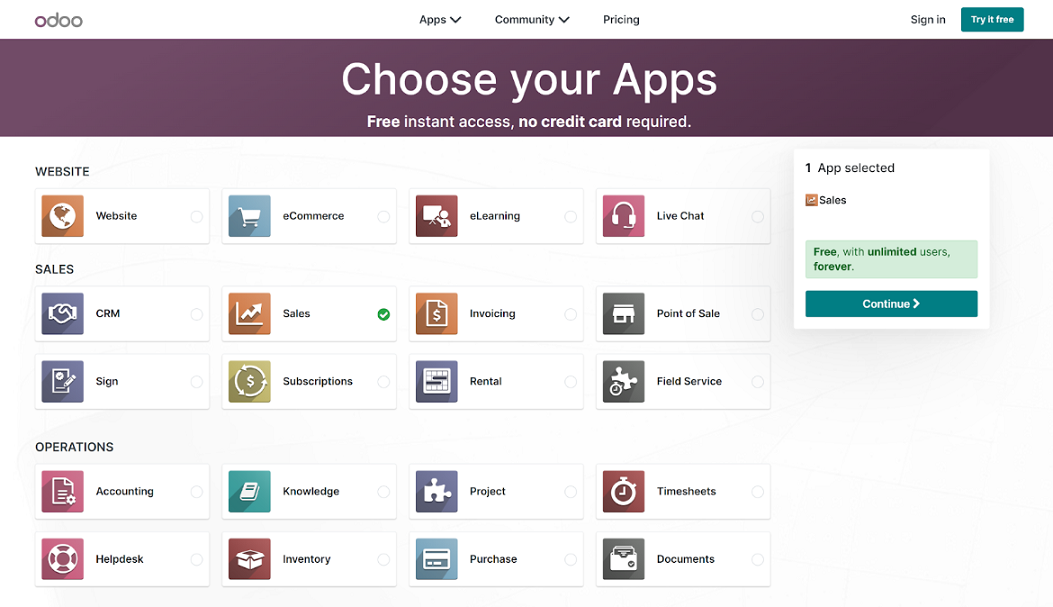 Tasuta pakett annab teile tasuta juurdepääsu ühele paljudest Odoo pakutavatest rakendustest. Kui otsustate hankida mõne muu rakenduse, pakub Odoo teile valitud rakenduste jaoks tasuta prooviversiooni.