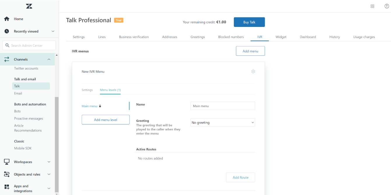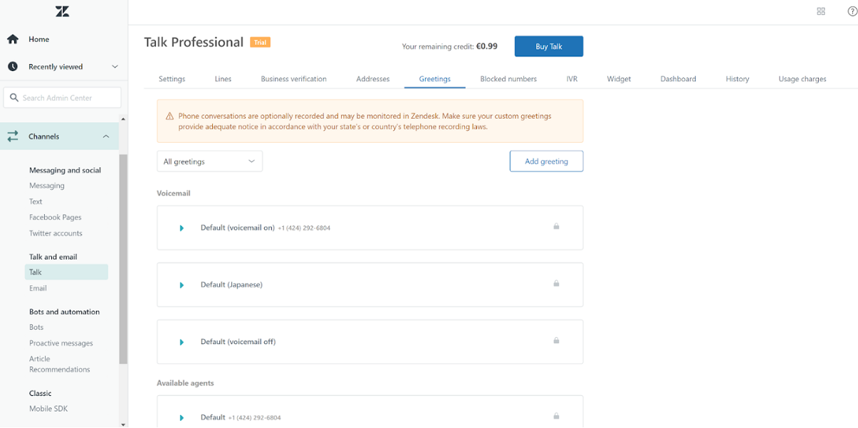 Zendeski prooviversiooni üks lahedamaid omadusi on see, et nad annavad teile kõnekeskuse funktsiooni proovimiseks tasuta telefoninumbri. Ma ei pidanud alustamiseks isegi keerulisi seadistusi läbima ja sain põhimõtteliselt kohe hakata helistama. Zendesk pakub ka võimalust lisada oma telefoninumbreid. Valiku leiate Administraatori keskusest Talki seadete alt. See sisaldab ka teie telefoniliinide erinevaid reguleerimis- ja kohandamisvalikuid, nii et saate kasutusjuhtumeid veidi täpsustada.