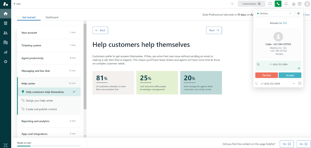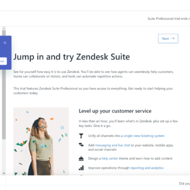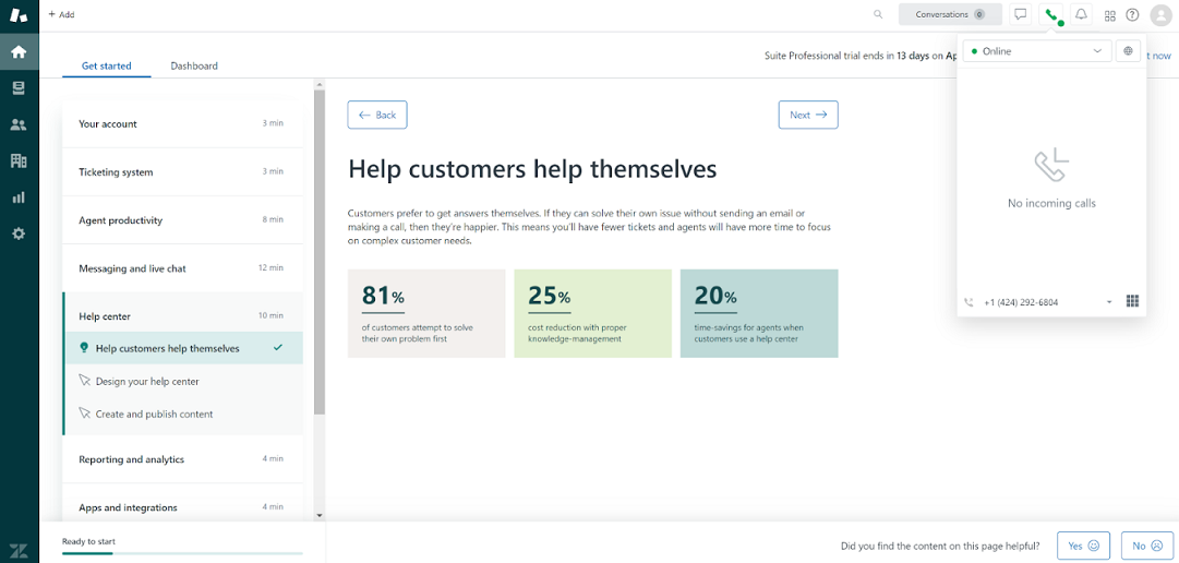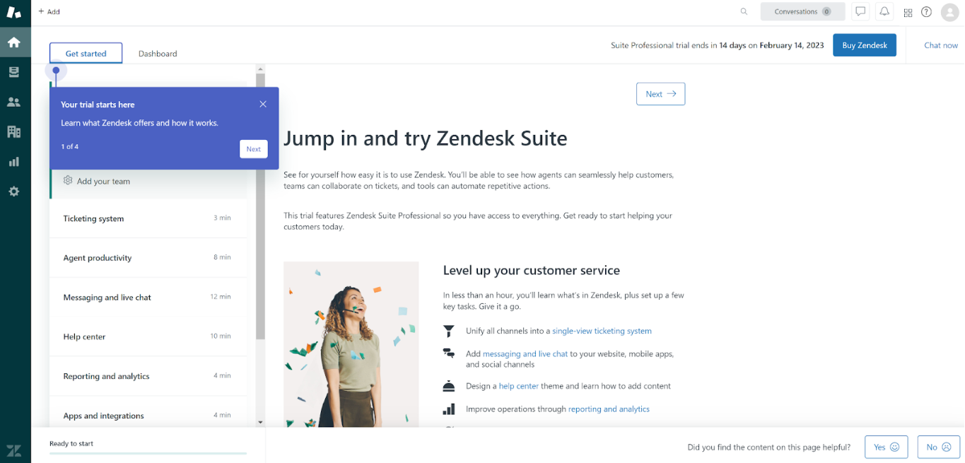 Zendeski prooviperiood pakub kasulikku võimalust. Saate määrata, kuidas soovite nende rakendust kasutada, ja hankida oma kasutusjuhtumi jaoks täiustatud ja kohandatud kasutuskogemuse. Soovi korral võite selle sammu vahele jätta, kuid soovitan tungivalt selle siiski läbida. Kui olete selle lõpetanud või vahele jätnud, suunatakse teid otse Zendeski liidesesse. Liides pakub mõningaid käepäraseid näpunäiteid, mis juhendavad teid ja aitavad teil Zendeskiga tutvuda.