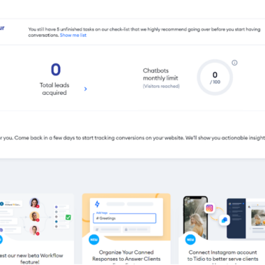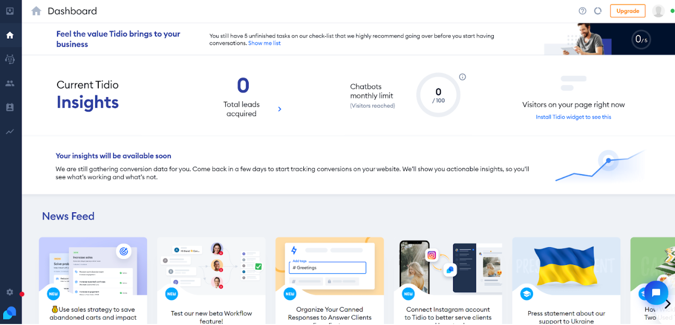 Kui olete registreerimise lõpetanud, suunatakse teid otse rakenduse juurde. Peamisel juhtpaneelil jagatakse mõningaid ülevaateid teie Tidio kontode kohta, samuti värskeid uudiseid ja Tidio värskendusi. Peamenüü valikud leiate rakenduse vasakpoolsest kontrastiribalt. Üldiselt on rakendus väga hästi disainitud, nii et ükski kasutaja ei peaks end Tidio funktsioonide otsimisel tundma eksinuna. Piletisüsteemi pääsete menüüjaotise Postkast alt, mis on esimene valik.