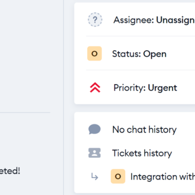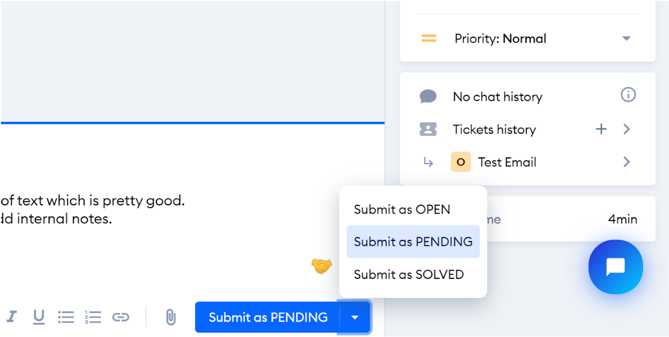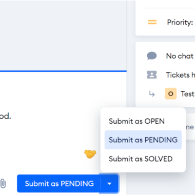 Tidio pakub teile ka mitmeid saatmisvõimalusi. Võite pileti saata ja muuta olekuks Avatud, Ootel või Lahendatud, olenevalt sellest, kas teie vastus lahendas kliendi probleemi. Parempoolne paneel sisaldab piletite ajalugu, prioriteetide seadeid, olekuseadeid, määramisteavet ja klienditeavet, mille saate täita otse piletis.