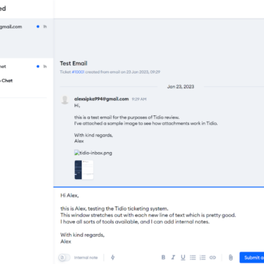 Pileti vastuse väli on alguses väga väike, kuid vastuse pikenedes see venib. See on hea disainilahendus, mille eesmärgiks on säästa ekraaniruumi. Tidio pakub mõningaid üldisi teksti redigeerimise ja vormindamise valikuid. Piletitele on võimalik lisada sisemisi märkmeid, mis on väga kasulik kliendipiletite kohta kolleegidele info jagamiseks, ilma et klient seda näeks.