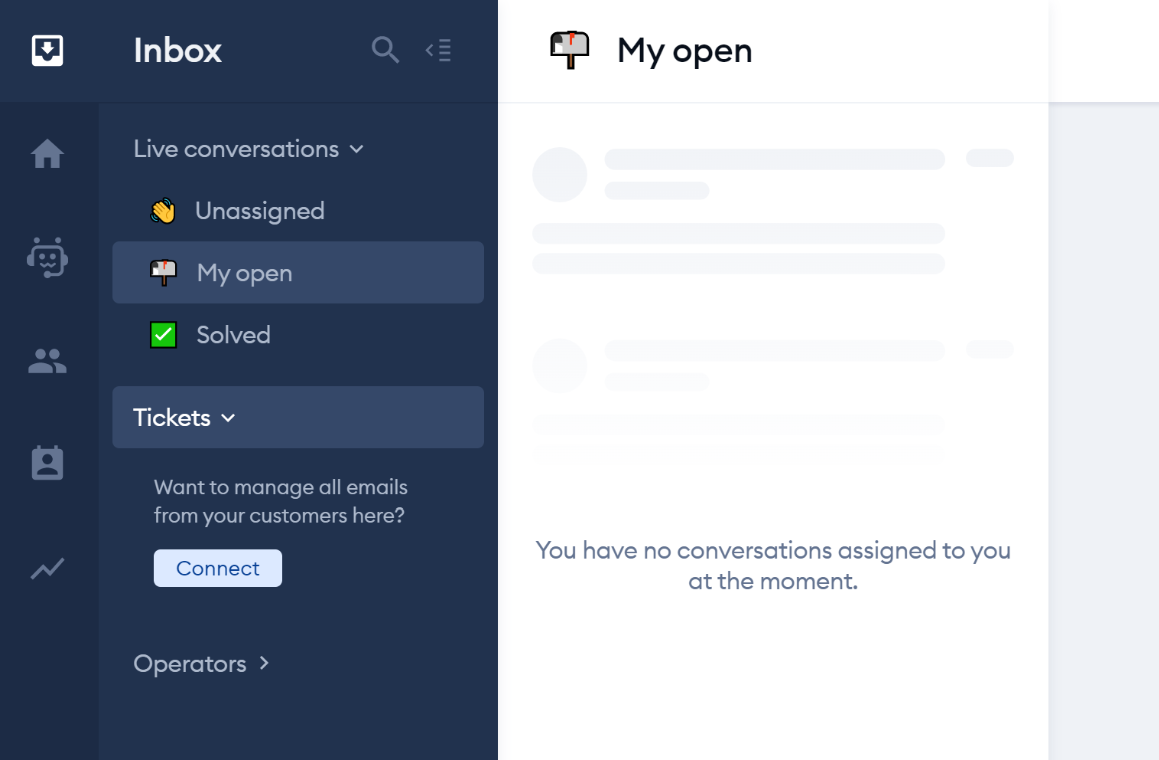 Kui olete oma Tidio kontol, avage Postkast ja leidke üles Piletisüsteem. Rakendus palub teil ühendada oma e-posti aadressi. Teil on kaks võimalust: looge uus Tidio e-post või ühendage olemasolev. Valige viimane variant. Tidio ei paku otsest integreerimist ühegi teenusepakkujaga, seega peate määrama e-kirjade automaatse ümbersuunamise oma Tidio kontole. Meilide edastamise seadistamine on olenevalt igast meiliteenuse pakkujast erinev, seega peate leidma juhendi, mis selgitab selle toimingu sooritamist. Mõned juhendid meilide edastamiseks leiate Tidio teadmusbaasist.
