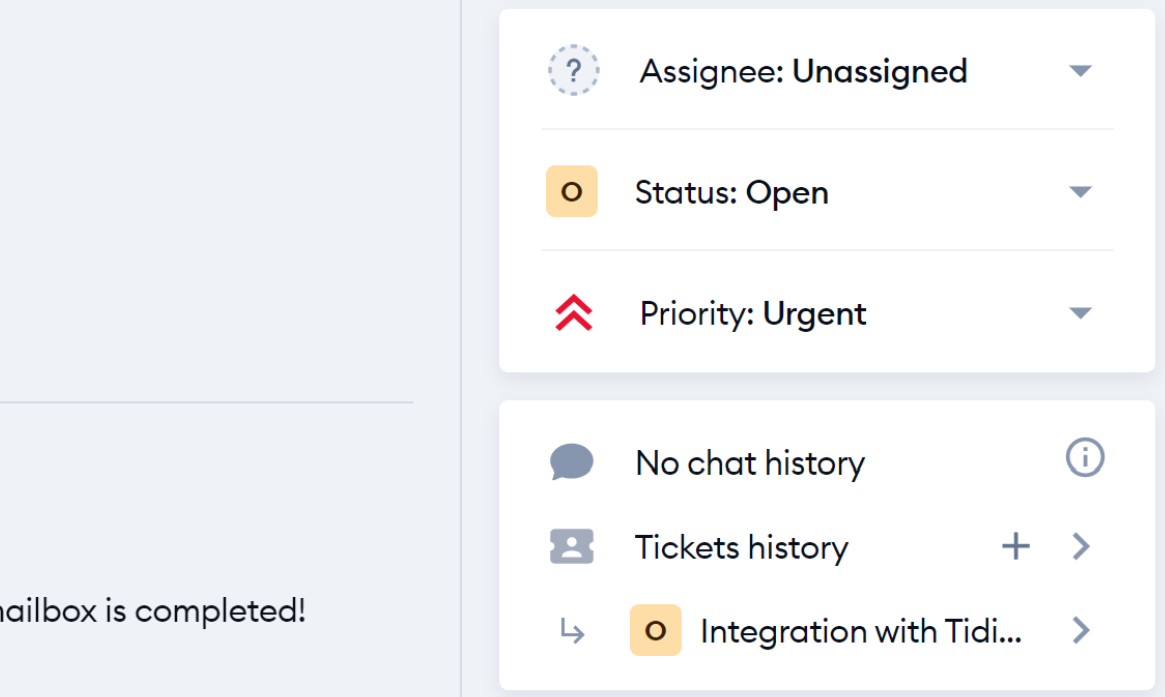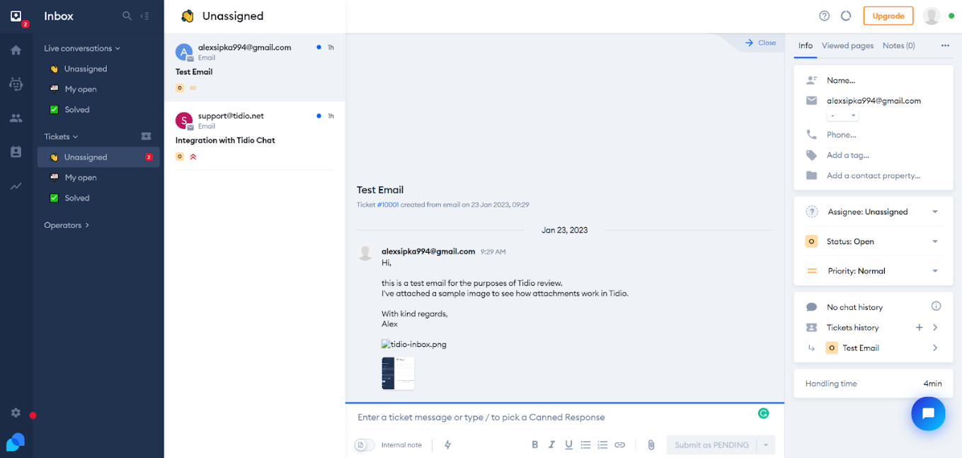 Ülevaate eesmärgil otsustasin luua uue e-posti konto. Tidio saatis mulle e-posti teel teavituse, et integratsioon on edukalt lõpule viidud. Igale saabunud kirjale pääseb ligi rakenduse postkasti jaotises. Enne tarkvara testimist vaatame mõnda märkimisväärset Tidio piletisüsteemi funktsiooni.