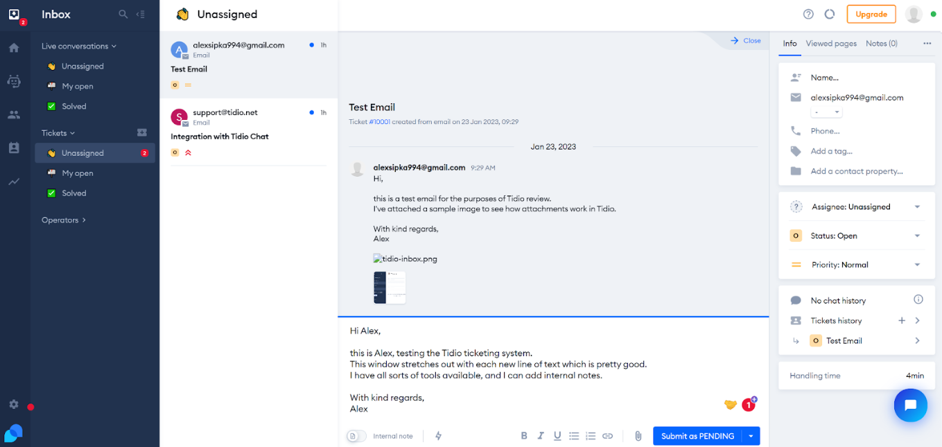 Testisin Tidio piletisüsteemi agendi vaatenurgast, et näidata teile selle toimivust ja anda teile aimu kogu süsteemi kasulikkusest. Kui saatsin endale testmeili, kulus paar sekundit, enne kui see mu Tidio postkasti ilmus. Ooteaeg ei olnud kuigi pikk. Tidio näitab iga pileti juures käepärast ajamärguannet, see annab igale agendile teada, millal pilet saabus.