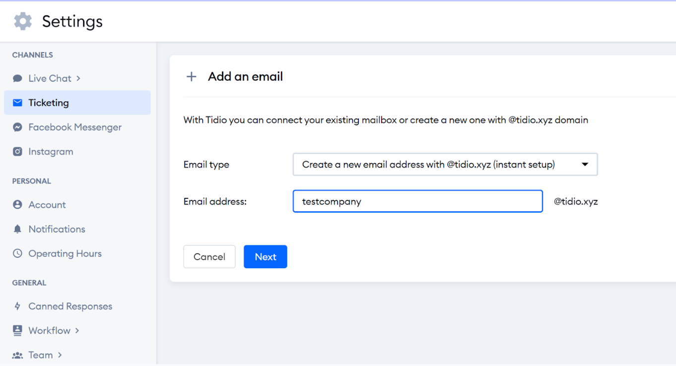 Avage oma Tidio konto ja minge seadetesse. Valige Piletisüsteem ja klõpsake käsul Loo postkast. Saate lisada juba olemasoleva e-posti aadressi või luua süsteemis spetsiaalse Tidio e-posti aadressi. Kui otsustate lisada oma e-posti aadressi, peate seadistama automaatse edastamise, et kõik piletid jõuaksid teie Tidio piletisüsteemi.