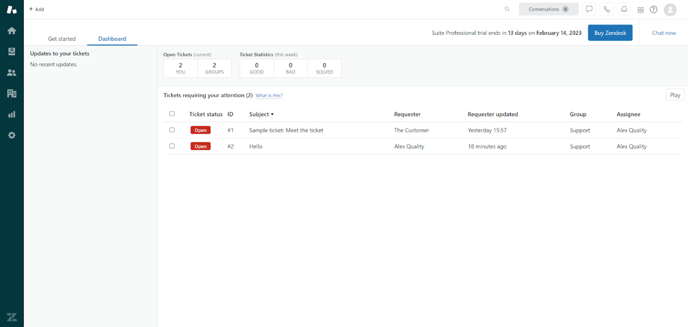 Zendeski liides on üsna lihtne ja hõlpsasti navigeeritav. Kõigile põhifunktsioonidele pääsete juurde vasakpoolselt paneelilt, samas kui suurema osa ekraaniruumist võtab teie poolt vaatamiseks valitud jaotis. See on kasulik ja teil ei tohiks tutvumisel probleeme tekkida. Kui otsustate juhendilt juhtpaneelile üle minna, tervitab teid kena piletisüsteemi liides.
