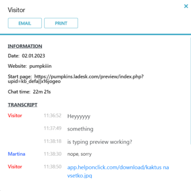 Veel üks kasulik funktsioon on andmed, mida HelpOnClick teie külastajate kohta automaatselt kogub. Need andmed hõlmavad külastaja asukohta, brauserit, IP-aadressi ja palju muud. Kui olete vestluse lõpetanud, saate selle teabe juurde tagasi pöörduda ja kogu vestluse arhiivist läbi lugeda.