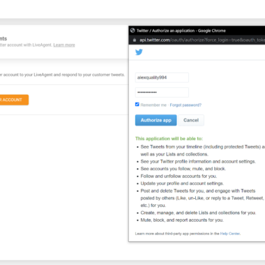 Ongi kõik. Facebooki ühendamine oli ülilihtne ja see võttis vähem kui minuti. Järgmine samm oli välja selgitada, kas see on Twitteri integreerimisega sama lihtne. See valik on saadaval LiveAgenti menüüs Seadete jaotise all. Peate lihtsalt lisama oma konto ja andma LiveAgentile load, nagu eelmises etapis. See protsess võtab teil isegi vähem aega kui Facebooki integreerimine.
