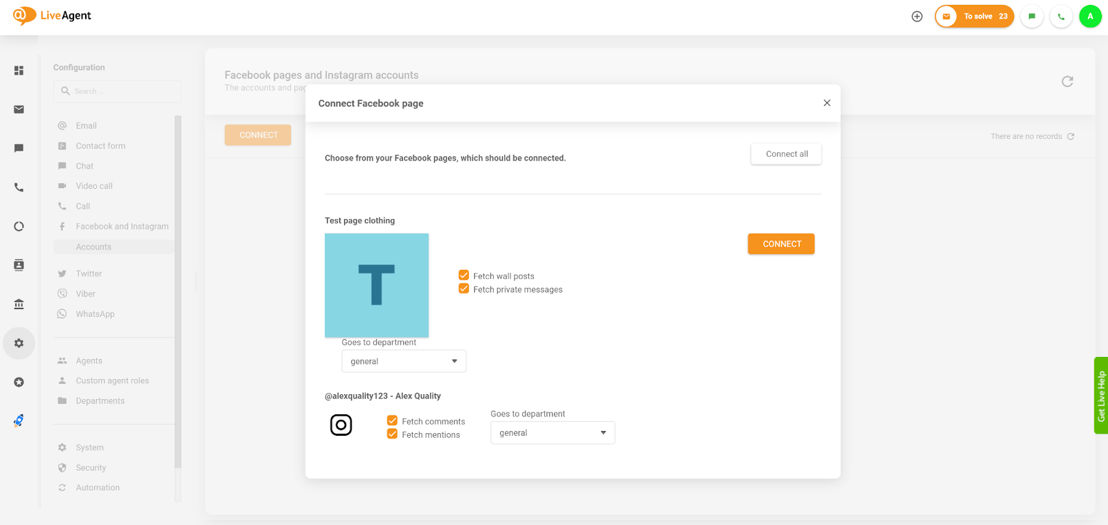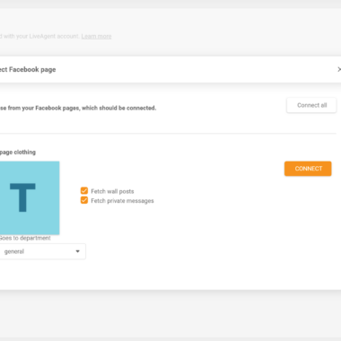 Esimene võimalusena pakutakse Facebooki integreerimist, nii et valisin alustamiseks selle. Pidin lihtsalt oma Facebooki kontole sisse logima ja võimaldama kogu vajaliku juurdepääsu oma väljamõeldud rõivaäri Facebooki lehele. Pärast seda, kui sain sõnumi ühendamise õnnestumisest, sain valida, millist tüüpi postitustega luban LiveAgentil ühenduse luua. Et asi oleks lihtsam, valisin kõik. Suurepäraseks lisaks on võimalus valida, milline LiveAgenti osakond saab juurdepääsu Facebooki piletitele, andes teile vabaduse oma suhtlust oma äranägemise järgi korraldada.