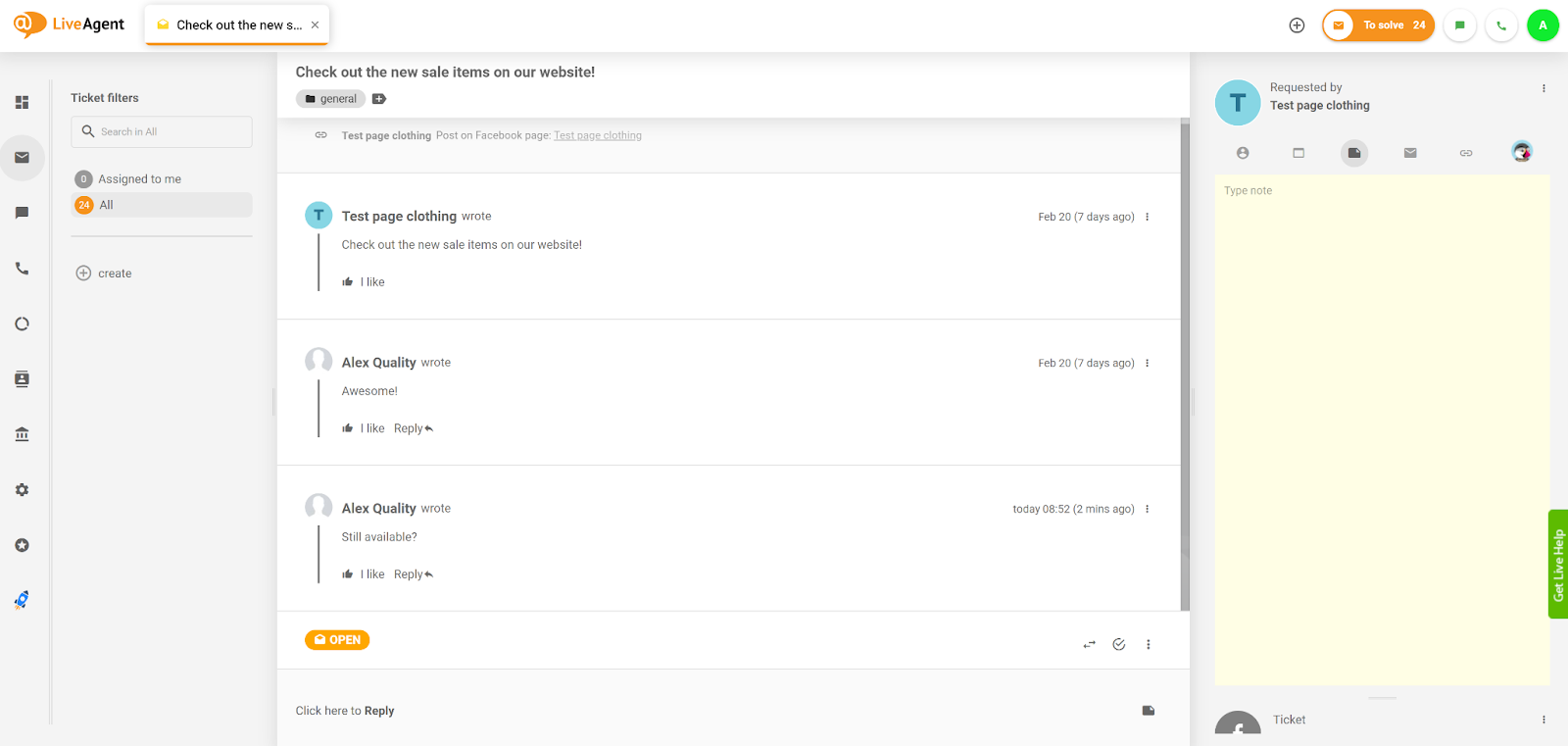 LiveAgenti sotsiaalmeedia kanalite ja funktsioonide testimine oli suisa lust. Kasutasin oma sotsiaalmeedia testkontosid agendikogemuse simuleerimiseks ja mul on hea meel tõdeda, et need kõik töötasid imehästi. Kõigepealt kirjutasin oma Facebooki ettevõtte lehe olekusse kommentaari, et saada teada, kas integratsioon toimib nii nagu peab. Kommentaar saabus paari sekundiga ja ilmus piletina minu universaalsesse postkasti.