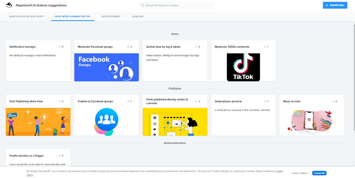 Viimane funktsioon, millest soovin lühidalt rääkida, on NapoleonCati funktsioonide soovitused. Siin näete väljatöötamisel funktsioone, avaldatud funktsioone ja saate soovitada puuduolevaid funktsioone. Mulle meeldis see, kuna see tagab läbipaistvuse ja võimaldab NapoleonCati klientidel tunda, et nad on osa tarkvara loomise protsessist.