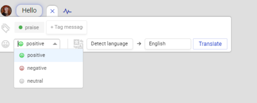 Kliendisõnumi kõrval oleval kolmel punktil klõpsates saate interaktsioonile määrata silte ja ka sentimenti. See mitte ainult ei aita teil korraldada oma kliendisuhtlust, vaid võimaldab teil luua ka üksikasjalikumaid ja kohandatud aruandeid.