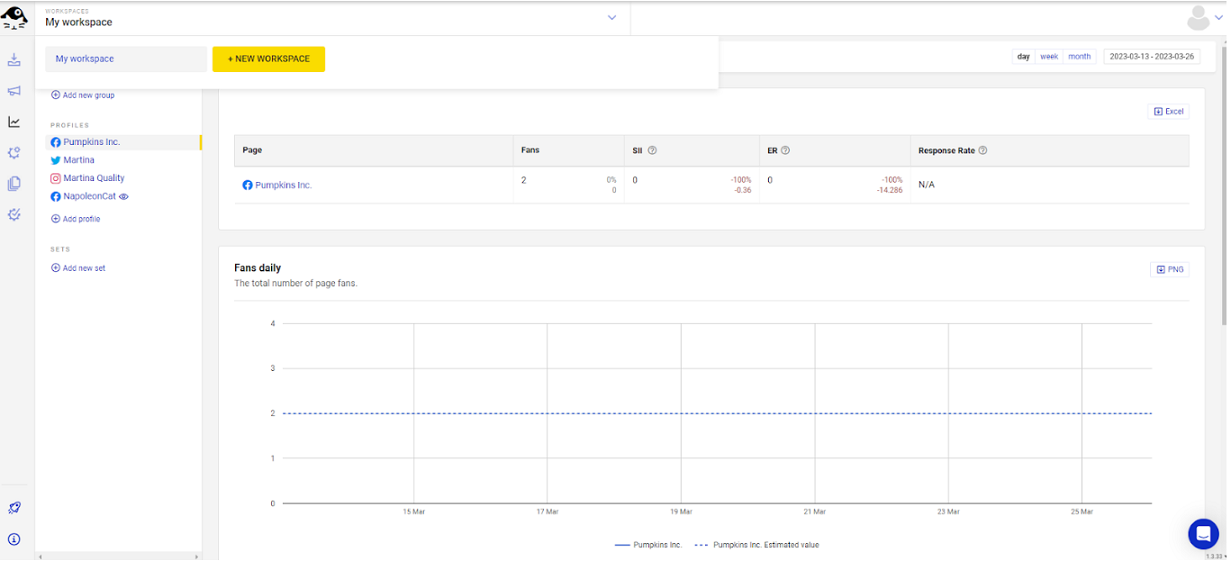 Lahendus pakub ka erinevaid allalaaditavaid aruandeid ja analüüse. Saate luua uusi aruandeid või ajastada need hilisemaks. Loomulikult on teil võimalus neid andmeid eksportida. NapoleonCat võimaldab teil seda teha Exceli lehe või PNG-failina.