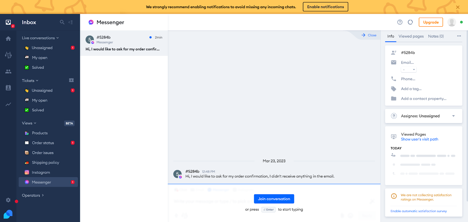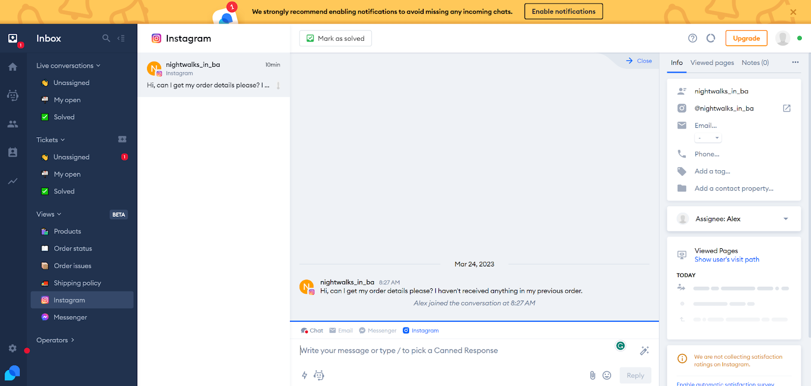 Suurepärane kogemus jääb kestma ka Instagrami päringuid käsitledes. Messengeri piletite ja Instagrami piletitega tegelemisel pole suurt vahet, süsteem töötab samamoodi. Tidio näitab pileti päritolu täpselt. Lisaks saate alati kasutada segmenteerimist tänu vasakpoolsele postkasti menüüveerule ja valida sõnumeid ainult kindlatest allikatest.
