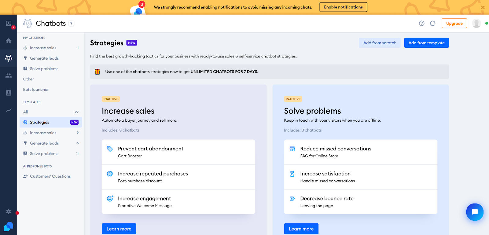 Chatbots plaan maksab sama palju kui Communicator plaan, kuid see keskendub veidi rohkem vestlusrobotite suhtlusele. Saate 1000 päästikuga vestlusrobotid, e-posti ja ööpäevaringse reaalajas vestluse toe, kõik tasuta paketi funktsioonid, 35+ vestlusroboti malli, visuaalse vestlusroboti redaktori ja Zapieri integratsiooni.