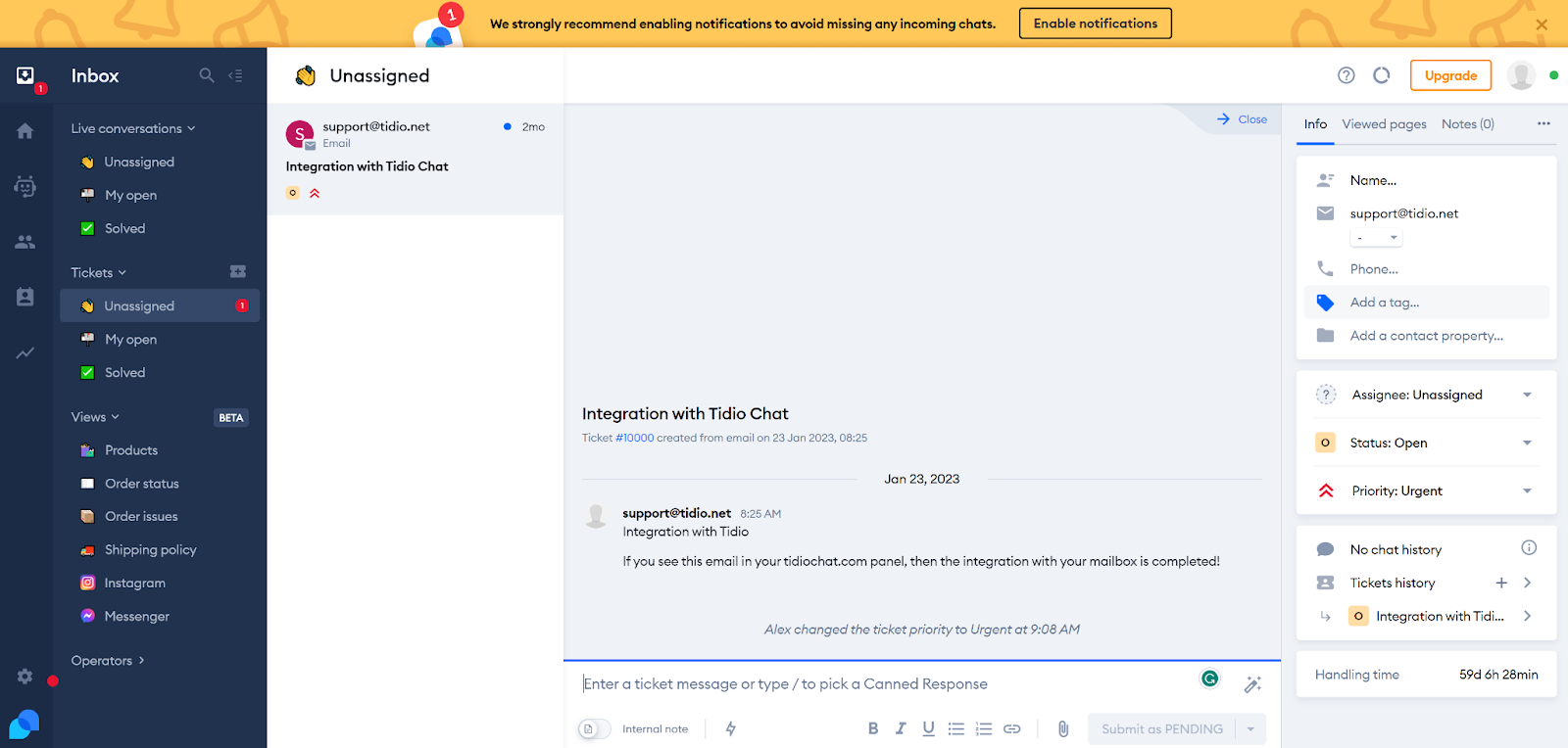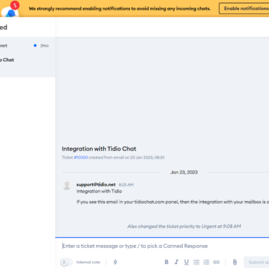 Tidio ei ole küll keskendunud sotsiaalmeedia klienditeenindusele, kuid pakub siiski väga head funktsionaalsust, mis ei jää konkurentsist palju maha. Üks osa sellest on piletisüsteem, mis koondab kogu teabe mis tahes tüüpi integreeritud sidekanalitest. Piletisüsteem pakub ka üsna standardset alamfunktsioonide komplekti, mis võimaldab tõhusalt vastata ja juurde pääseda kontaktandmetele. See funktsioon töötab hästi ka sotsiaalmeedia integratsioonidega.