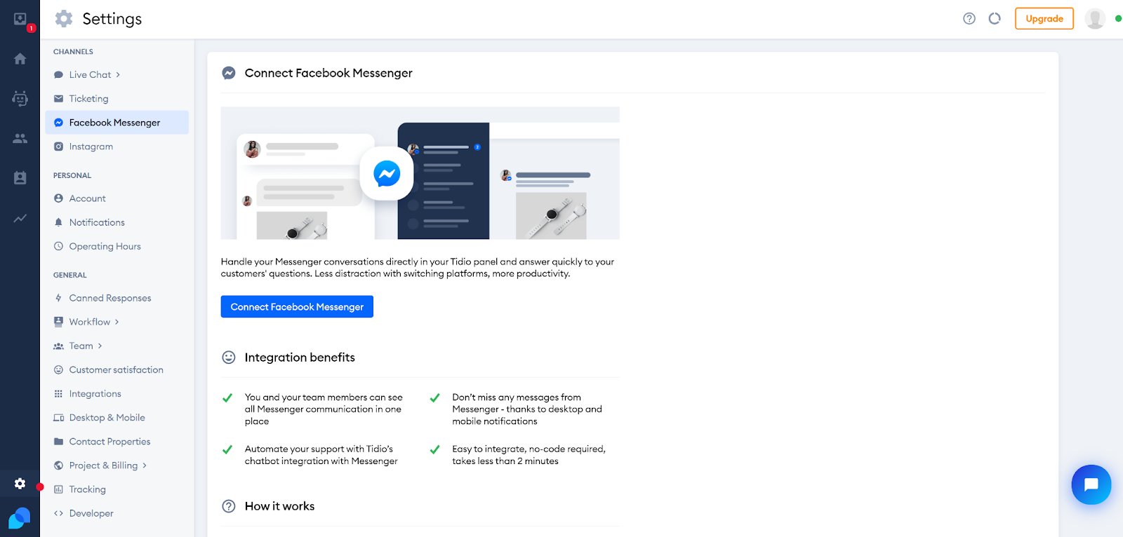 Üldiselt pakub Tidio mõlema sotsiaalmeedia kanali integreerimiseks uskumatult lihtsat ja intuitiivset viisi. Enne kui asun selle ülevaate testimise osasse, vaatame üle, milliseid sotsiaalmeedia funktsioone võite Tidolt oodata, ning milliseid lisafunktsioone saate, kui otsustate seda kasutada oma peamise sotsiaalmeedia klienditeeninduse tarkvarana.