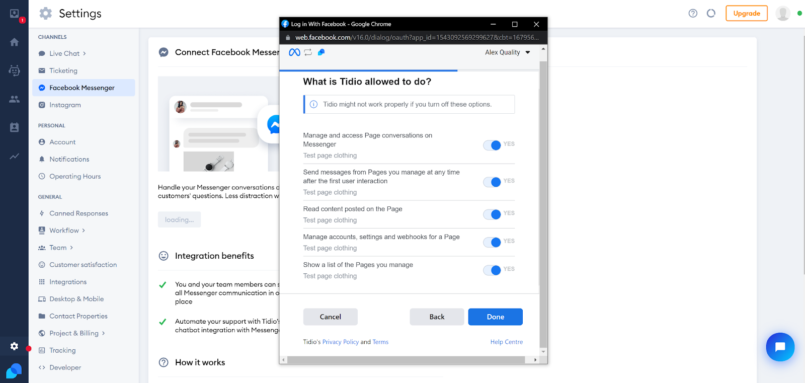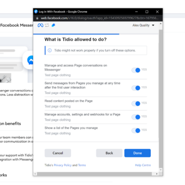 Kui klõpsasin Facebook Messengeri integreerimisel, suunati mind uuele ekraanile, kus nägin integreerimise eeliseid ja selgitust, kuidas integratsioon toimib ning milline näeb välja ühendamisprotsess. Integreerimisprotsess on üsna tavaline, pidin vaid sisse logima ja andma Tidio’le vastavad load minu Messengeri andmete käsitlemiseks. Tidio pakub ka võimalust ühendada Messengeri integratsioon oma vestlusrobotiga. Keeldusin sellest valikust, kuna käsitlesin vestlusroboteid juba Tidio vestlusroboti arvustuses.