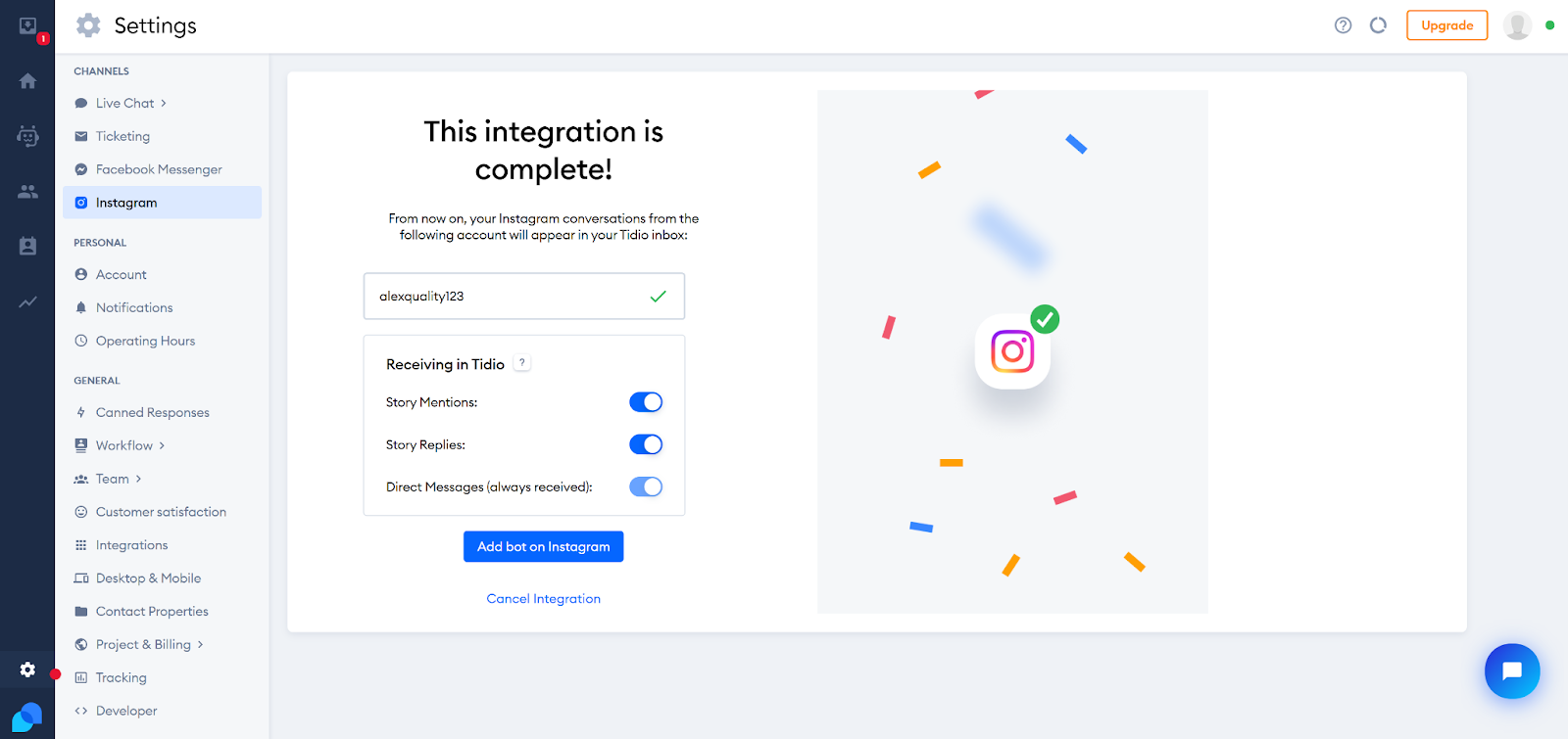 Instagrami integreerimisel võite oodata sama või vähemalt väga sarnast integreerimisprotsessi. Ekraan on sisuliselt sama, mis Facebook Messengeri integreerimiselgi. Instagrami suhtluse haldamiseks peate sisse logima ainult oma Instagrami kontole ja andma Tidiole juurdepääsu. Ma ei sattunud Instagrami integreerimise ajal probleemidesse ja kõik toimis väga hästi.