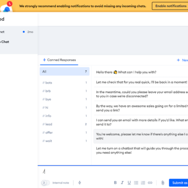 Kui klõpsate nupul Liitu vestlusega, saate alustada vastamisega. Liides on väga hästi kujundatud. Minu kontaktteave oli paremal pool, ekraani keskosa keskendus sõnumitele. Huvitav ja kõigi piletitüüpide puhul kasutatav funktsioon, on võimalus vajutada klaviatuuril klahvi “/”, et kutsuda välja valmis kirjutatud vastuste loend. See võimaldab teil püsida vestluses, ilma et peaksite lahkuma klaviatuurilt ja otsima vastavat nuppu liidesest.