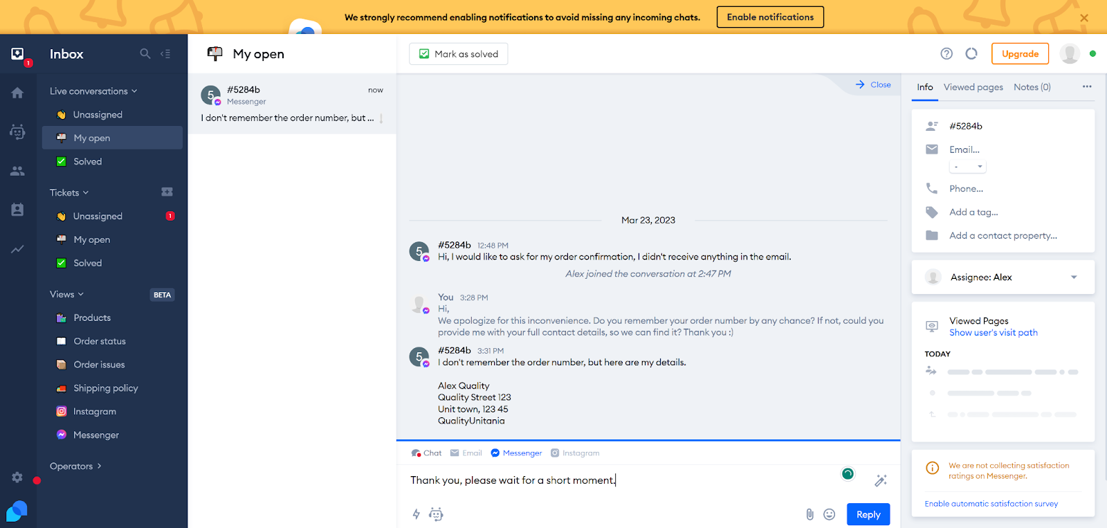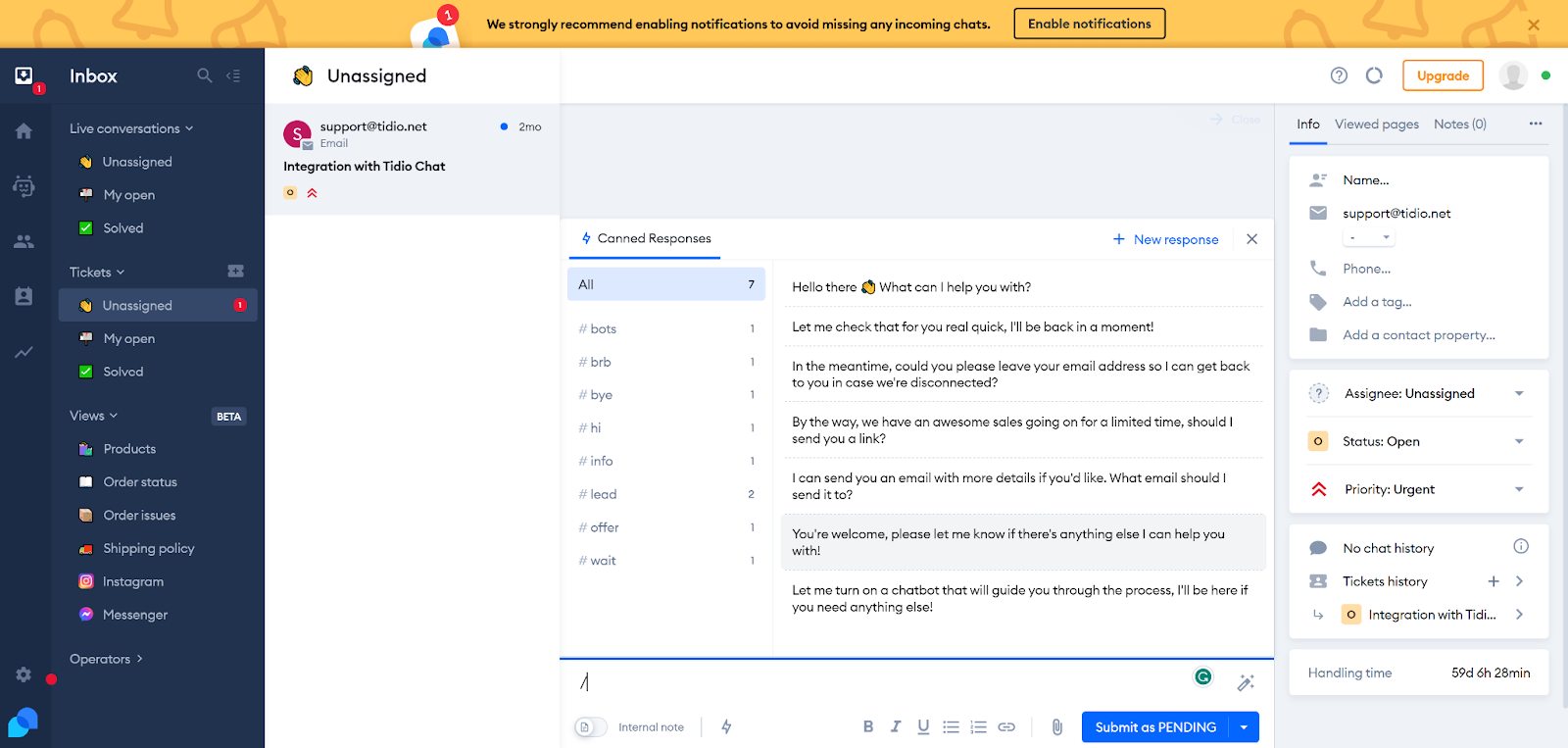 Tidio piletite kaudu vestlemine on meeldiv kogemus, mis ei vedanud mind alt. Kogu süsteem on väga hästi välja töötatud ja sellel pole sisuliselt probleeme. Ükskõik, kas vastate Instagrami või Messengeri kaudu, saate kindlasti meeldiva kogemuse. Tidio reageerib väga hästi igat tüüpi sotsiaalmeedia suhtlusele ja annab alati märku, kui postkasti midagi uut saabub.