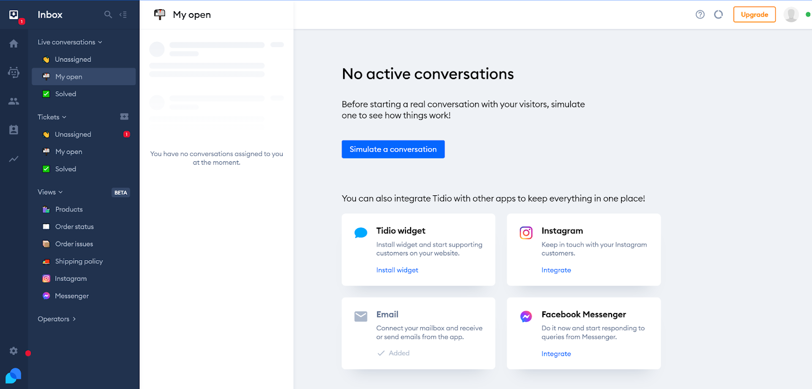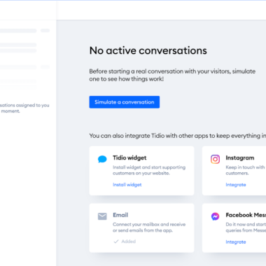 Kui ma jõudsin oma postkasti, teavitas Tidio mind minu aktiivsetest vestlustest. Mis veelgi parem, tarkvara pakkus integreerimist e-posti, Tidio vidina ja Facebooki ning Instagramiga. Sellelt lehelt on näha kõik Tidio pakutavad sotsiaalmeedia funktsionaalsused. Siinkohal võite jätkata Tidioga tutvumist või sukelduda sotsiaalmeedia integreerimise protsessidest. Alustasin kõigepealt oma Facebook Messengeri integreerimisega.