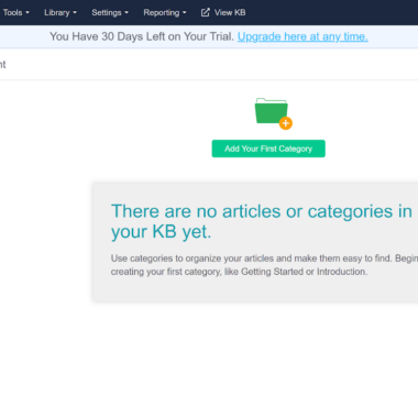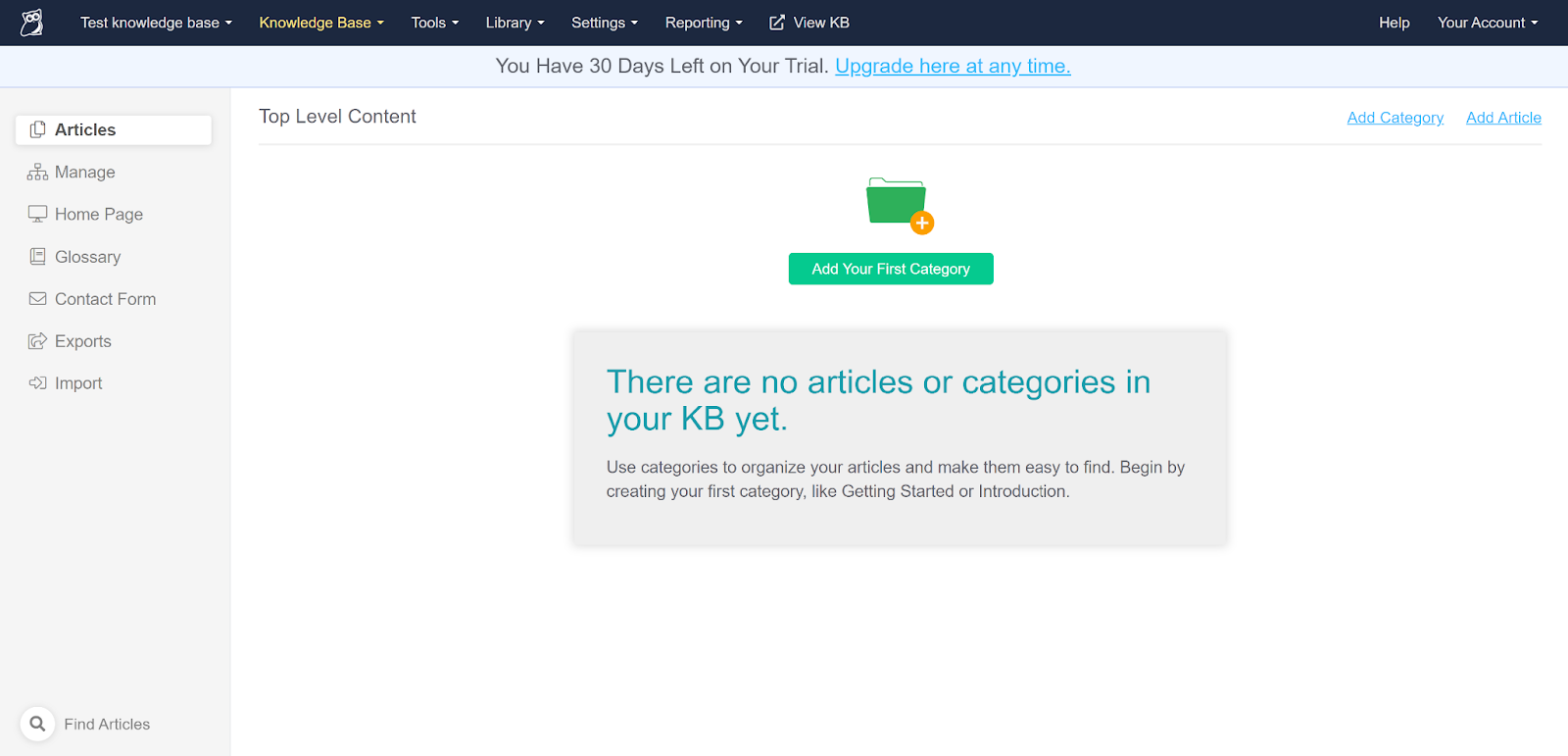 Kuna KnowledgeOwl on teadmusbaasile pühendunud tarkvara, millel pole muid funktsioone, pole teadmusbaasi funktsiooni ennast üldse vaja otsida. Saate sinna kohe alguses siseneda ja asuda juhendite ja artiklite kirjutamisega. Siiski võite tutvuda teiste ülemises menüüs sisalduvate teadmusbaasi tööriistade ja funktsioonidega. Saate hiljem siseneda kogu oma artiklite teeki või uurida ulatuslikke seadete valikuid. Võimalusi on palju, sealhulgas teadmusbaaside juurdepääsutaseme muutmine, teadmusbaasi stiili ja kujunduse seadistamine, turbevalikud ja palju muud.