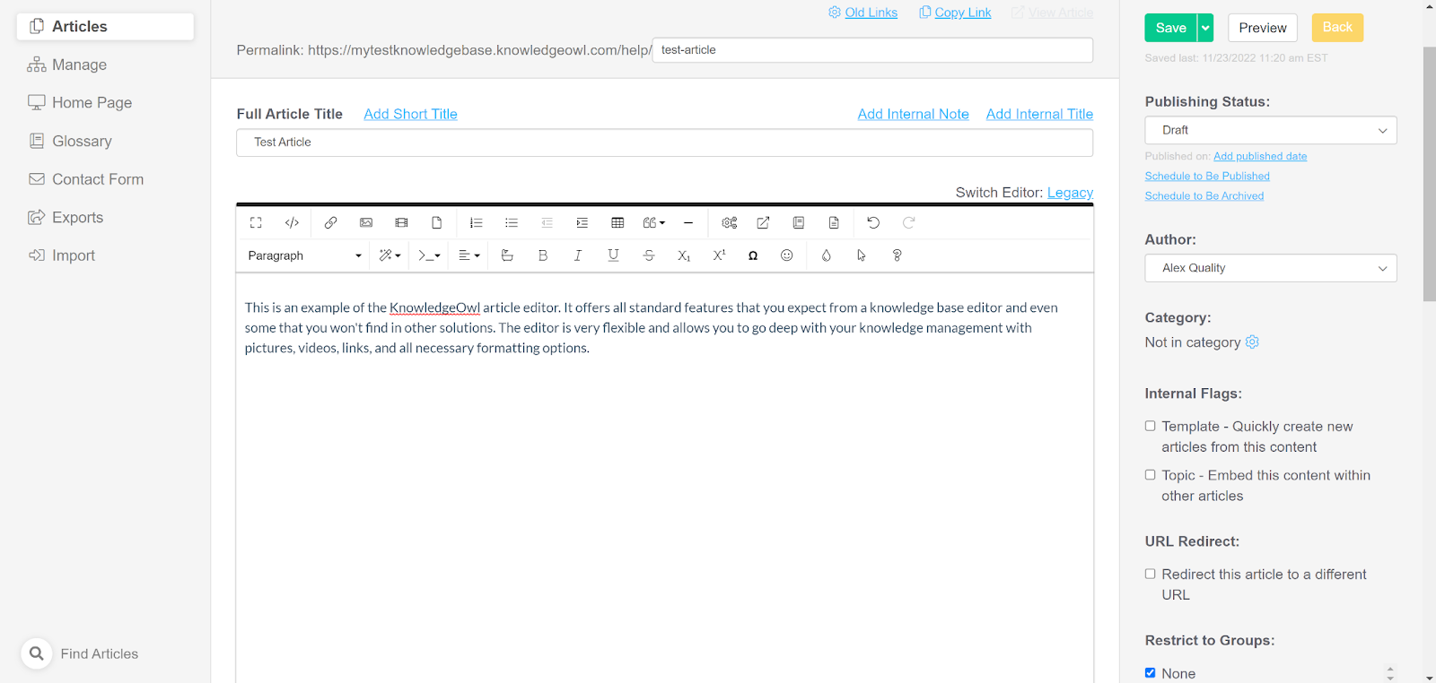 Saate kõik standardsed redigeerimis- ja vormindusfunktsioonid, meediumitoe – pildid ja videod, aga ka muud võimalused, sealhulgas SEO, kategooriad, autorluse ja palju muud. Redaktoril on isegi automaatse salvestamise funktsioon, mille avastasin juhuslikult, kuna olin prokrastineerinud ja KnowledgeOwl logis mind vahepeal välja. See on väga lahe asi mitte ainult laisklemiseks, vaid ka katastroofiliste stsenaariumide ärahoidmiseks, nagu interneti ühenduse katkemine, sülearvuti aku tühjenemine jne.