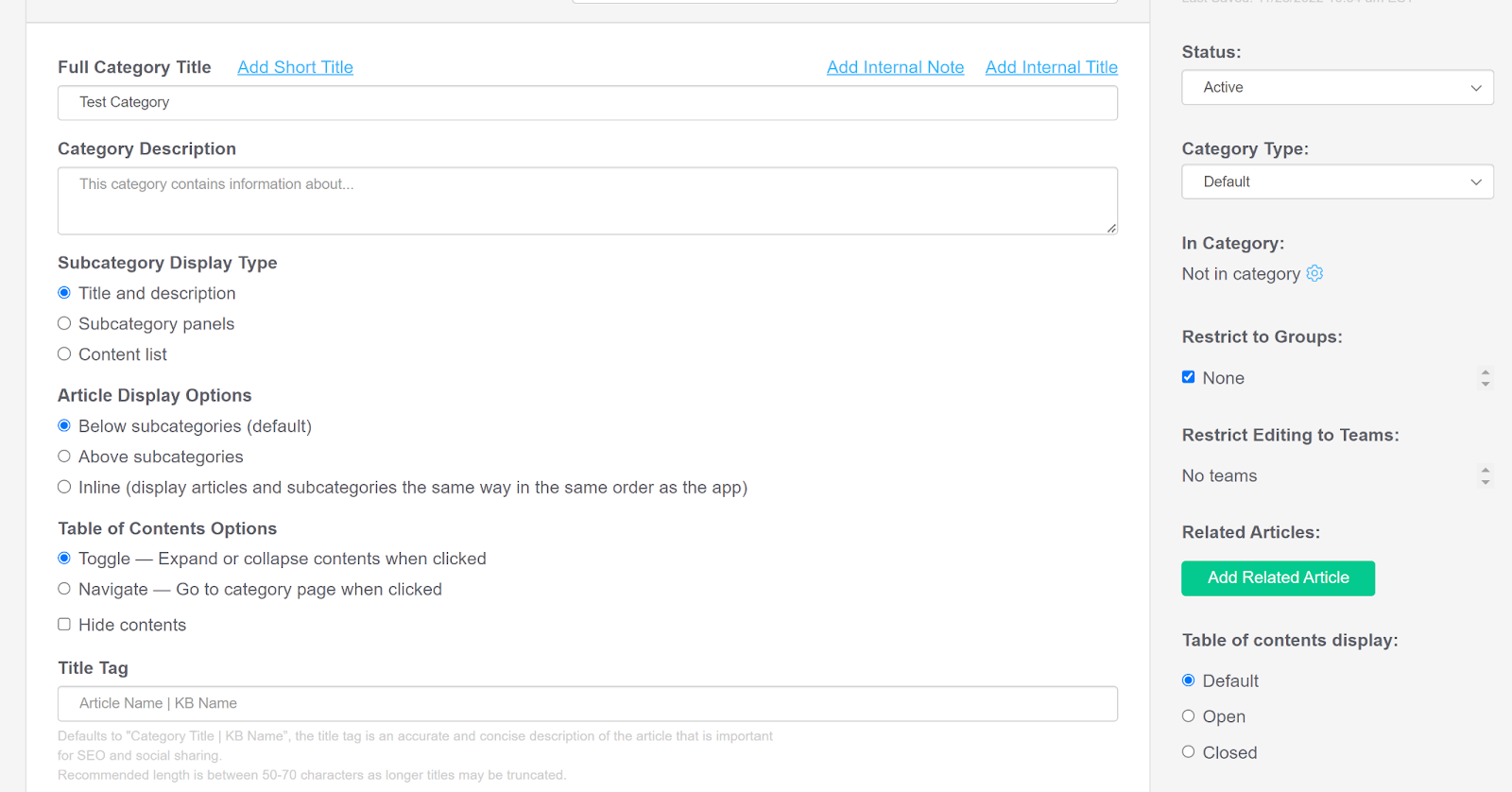 Teadmusbaas ei kutsu teid kirjutama esimest artiklit, kuid see kutsub teid looma esimest kategooriat, mis on veelgi parem. See muudab teie teadmusbaasi korraldamisega alustamise väga lihtsaks juba enne kirjutamise alustamist. Saate anda oma teadmusbaasi kategooriale nime ja valida oma kategooria jaoks mitme sihtlehetüübi hulgast. See pole veel kõik; hiljem saate läbida veel ühe seadistuste komplekti, kus on võimalik valida artikli kuvamisvalikud, silte, metakirjeldusi ja palju muud.