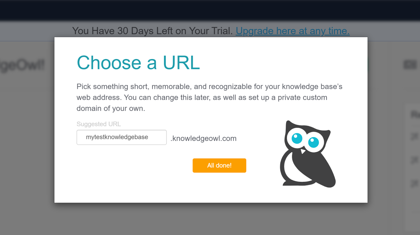 KnowledeOwli proovimiseks peate vaid registreerima uue konto oma e-posti aadressiga ja oletegi valmis alustada. KnowledgeOwl juhatab teid algusesse lihtsa valikute komplektiga, kus saate sisestada oma autori nime, anda oma teadmusbaasile nime ja valida oma teadmusbaasi URL-i. Pärast seda tervitatakse teid liideses ja saate rakendust sirvima hakata.