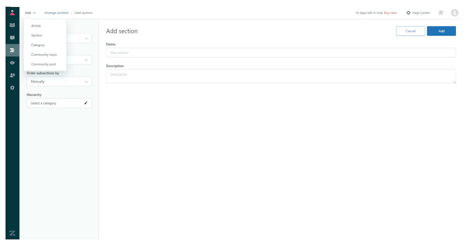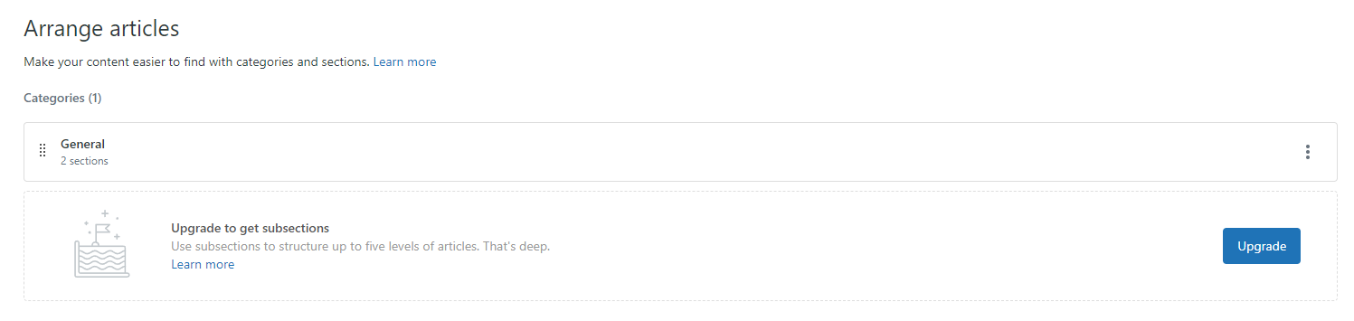 Artiklitele alamjaotiste lisamiseks minge vahekaardile Artiklite korrastamine ja ostke alamjaotiste täiendus. Klõpsates nupul Uuenda versiooni, saate osta ja seejärel lisada selle täienduse otse oma teadmusbaasi tarkvarasse.