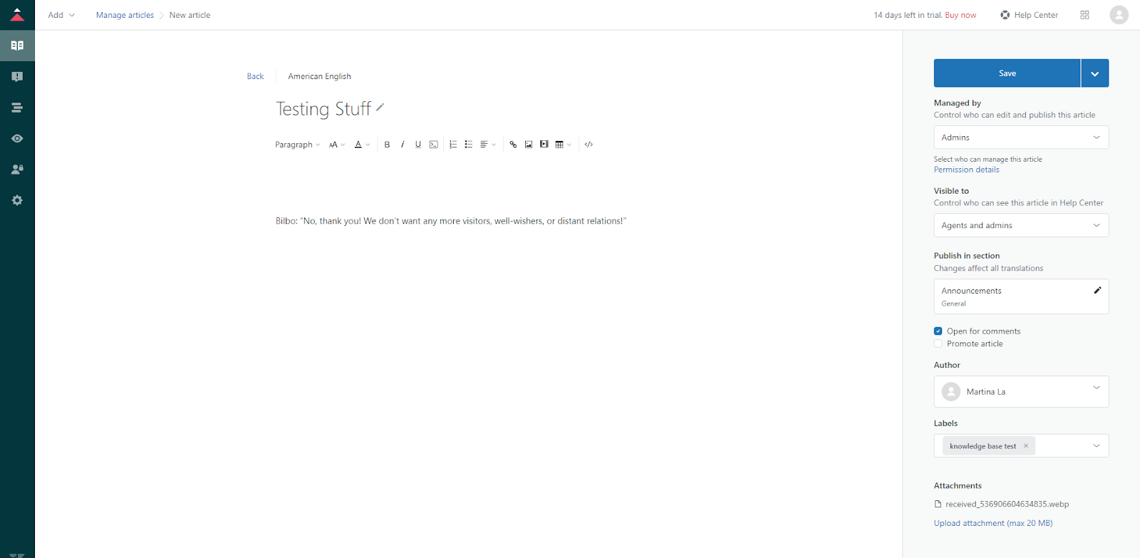 Ja kui aus olla, siis pärast kõike seda tundus mulle teadmusbaasi artikli loomine veidi napp. Saate sisu redigeerida, silte lisada, kategoriseerida ning pilte ja muud meediat üles laadida. Kui olete lõpetanud, saate artikli salvestada või otse avaldada. Kõik see on suurepärane ja kasulik, kuid tundus siiski väikse pettumusena, eriti pärast seda, kui selle leidmine võttis nii palju aega.