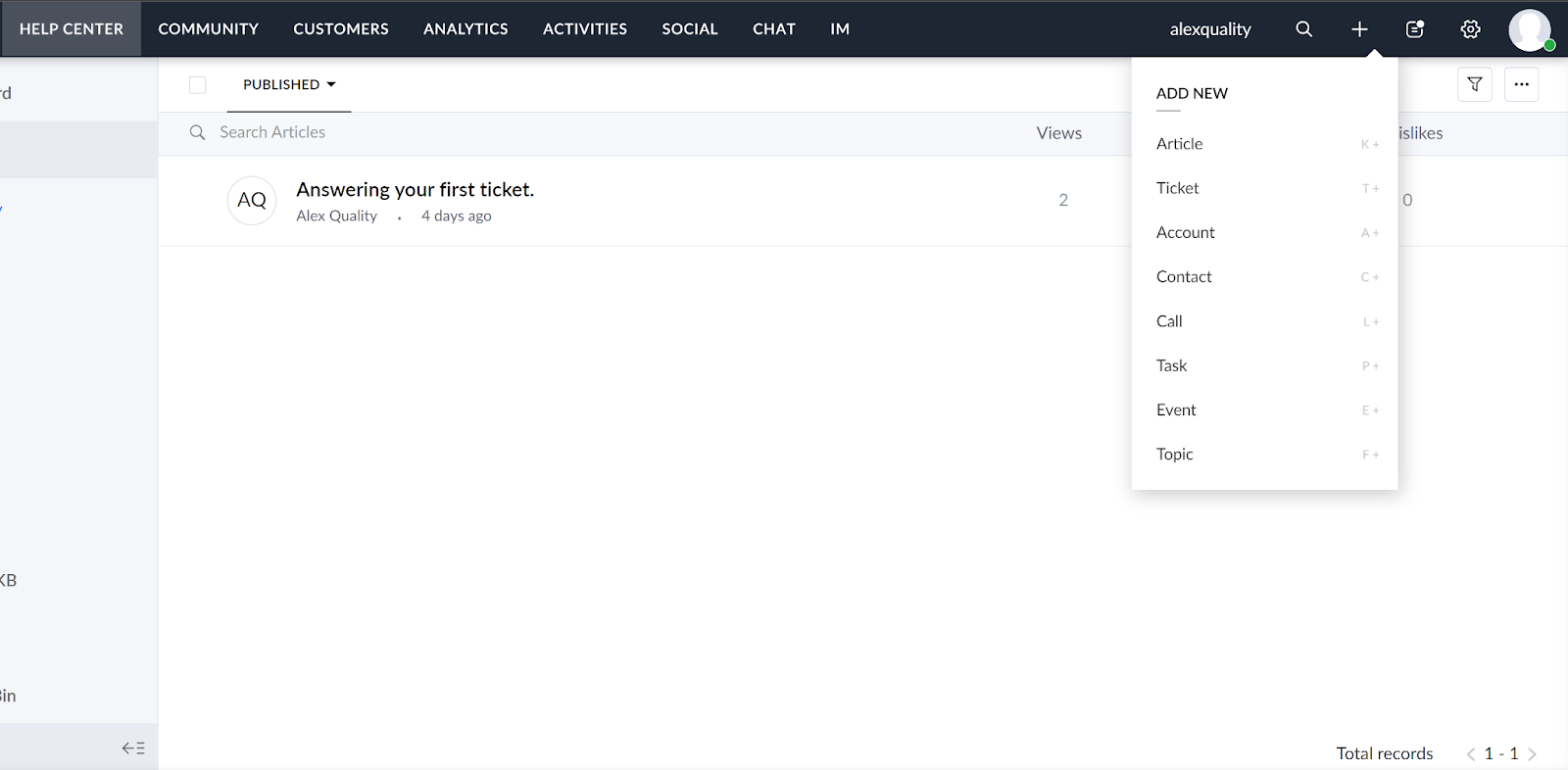 Zoho Deski teadmusbaasi artikleid saab luua klõpsates ülemisel menüüpaneelil pluss nupul. Sealt leiate uue artikli loomise võimaluse.