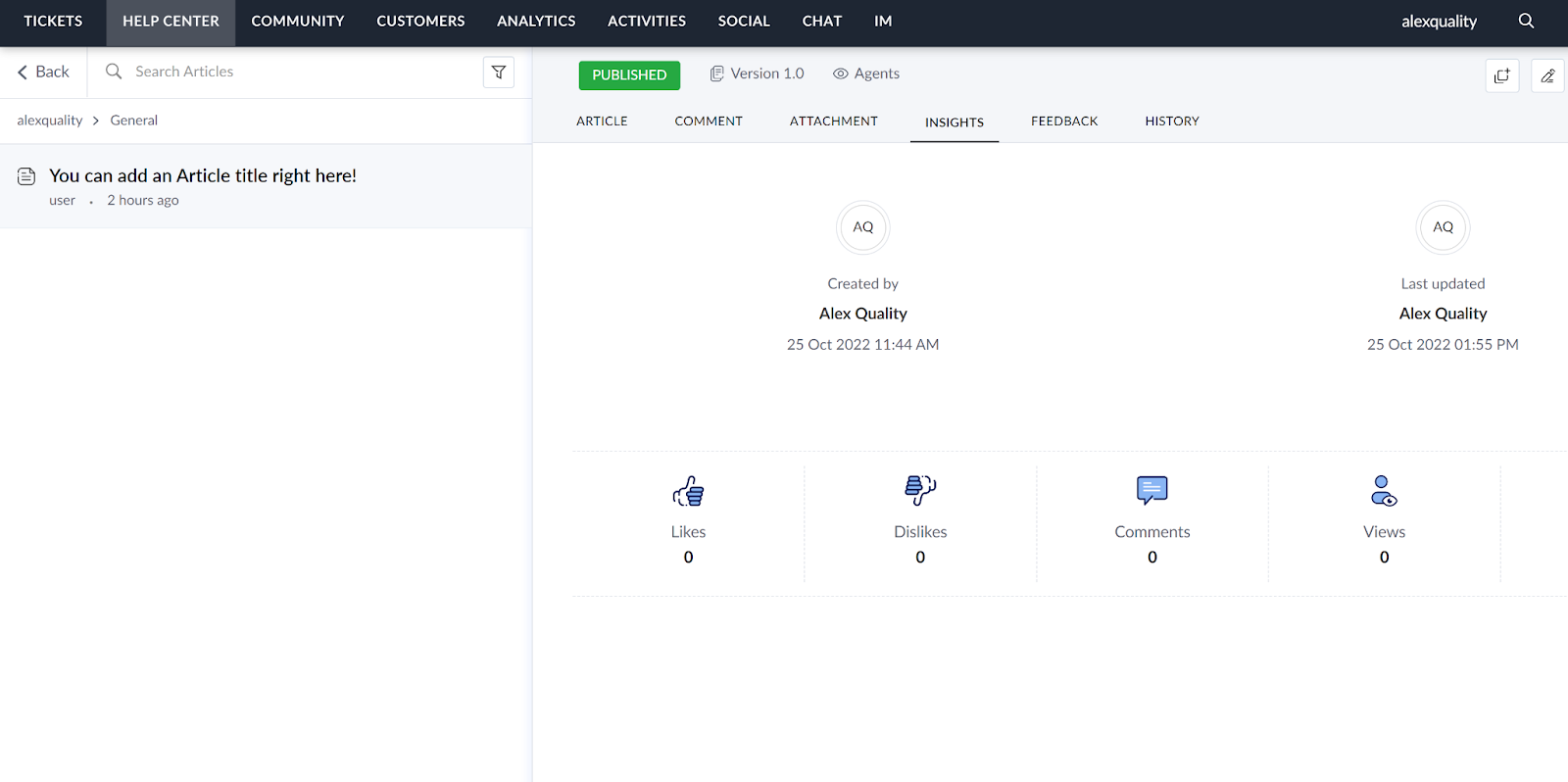 Artikli salvestamisel naasete teadmusbaasi avakuvale ja näete kõiki artikleid. Artiklite korraldamine, kuigi oma funktsionaalsuselt piisav, võiks olla mugavam. Saate valida artikli kategooria iga artikli üksikasjade seest, kuid neid ei saa ühe hulgitoiminguga muuta. Kategooriat tuleb muuta iga artikli jaoks eraldi, seega ärge unustage seda teha enne artikli avaldamist.
