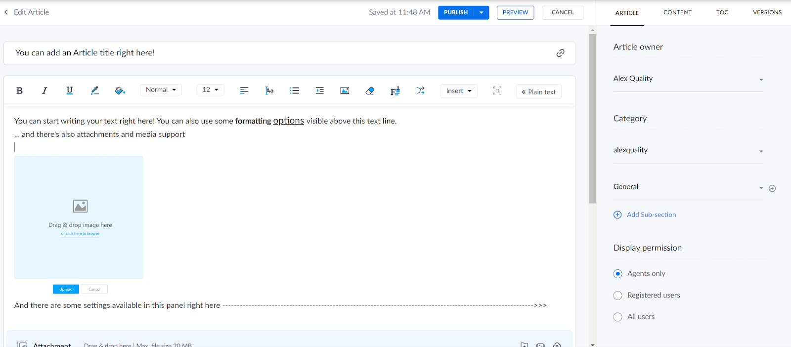 Artikliredaktoriga töötamine on sujuv ja teil ei teki probleeme funktsioonide leidmisega. Artiklite kirjutamine on täiesti probleemitu ja lisada saab ka pilte. Samuti on võimalus manustada videoid, HTML-koode, tabeleid ja muid üksusi. Saate alati lülituda täisekraanvaatele, et oma kirjutamisele paremini keskenduda. See on tõesti suurepärane teadmusbaas, millest ei puudu midagi olulist.